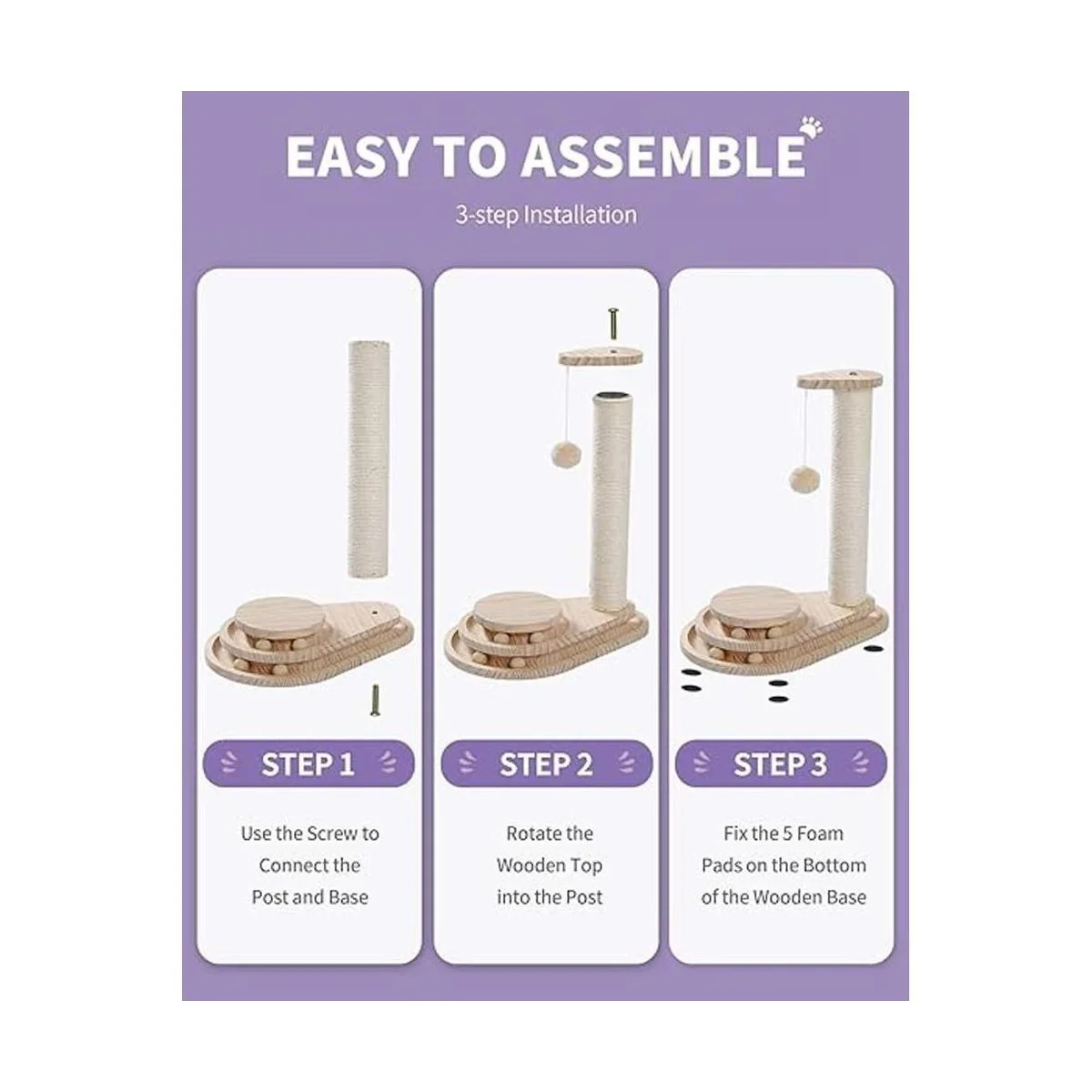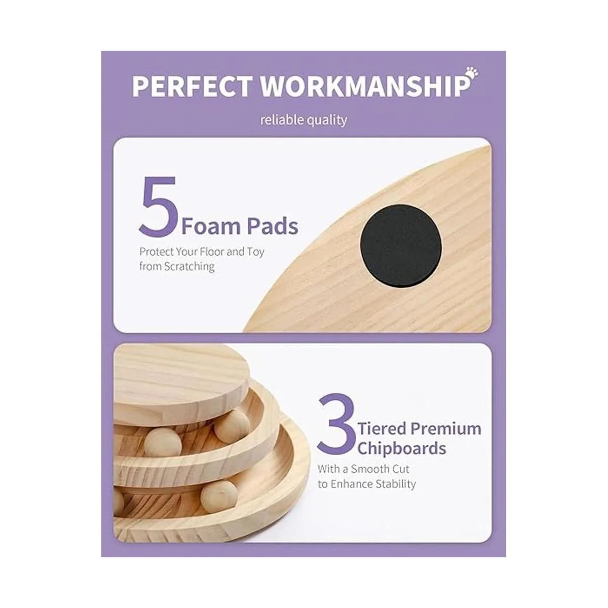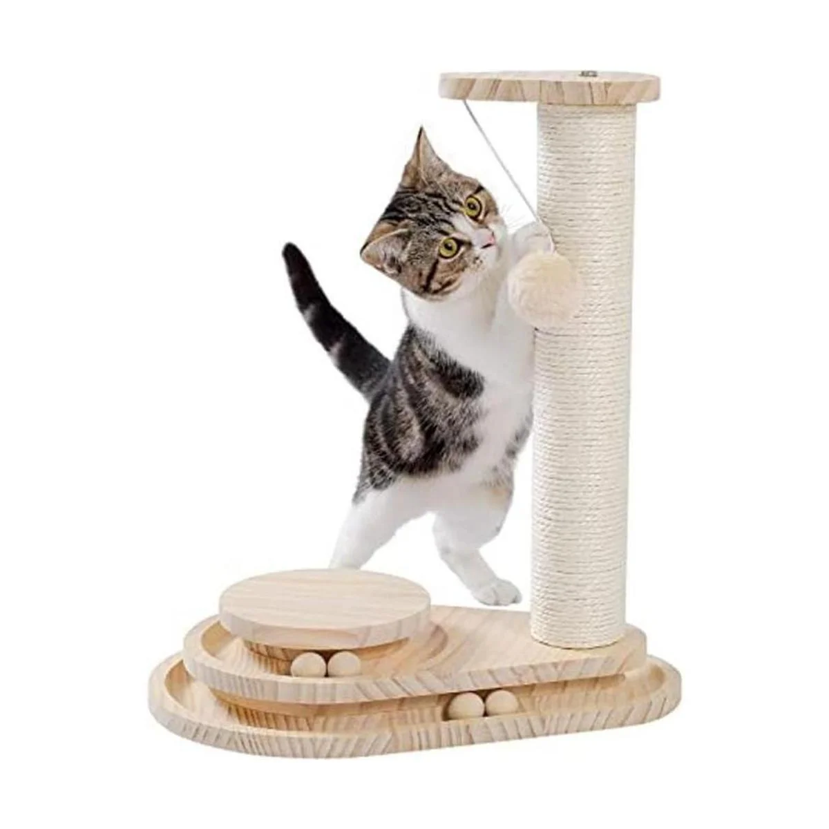 Made4Pets Tocadiscos de madera para gatos con poste rascador para gatos de dos capas con bolas interactivas y bola colgante