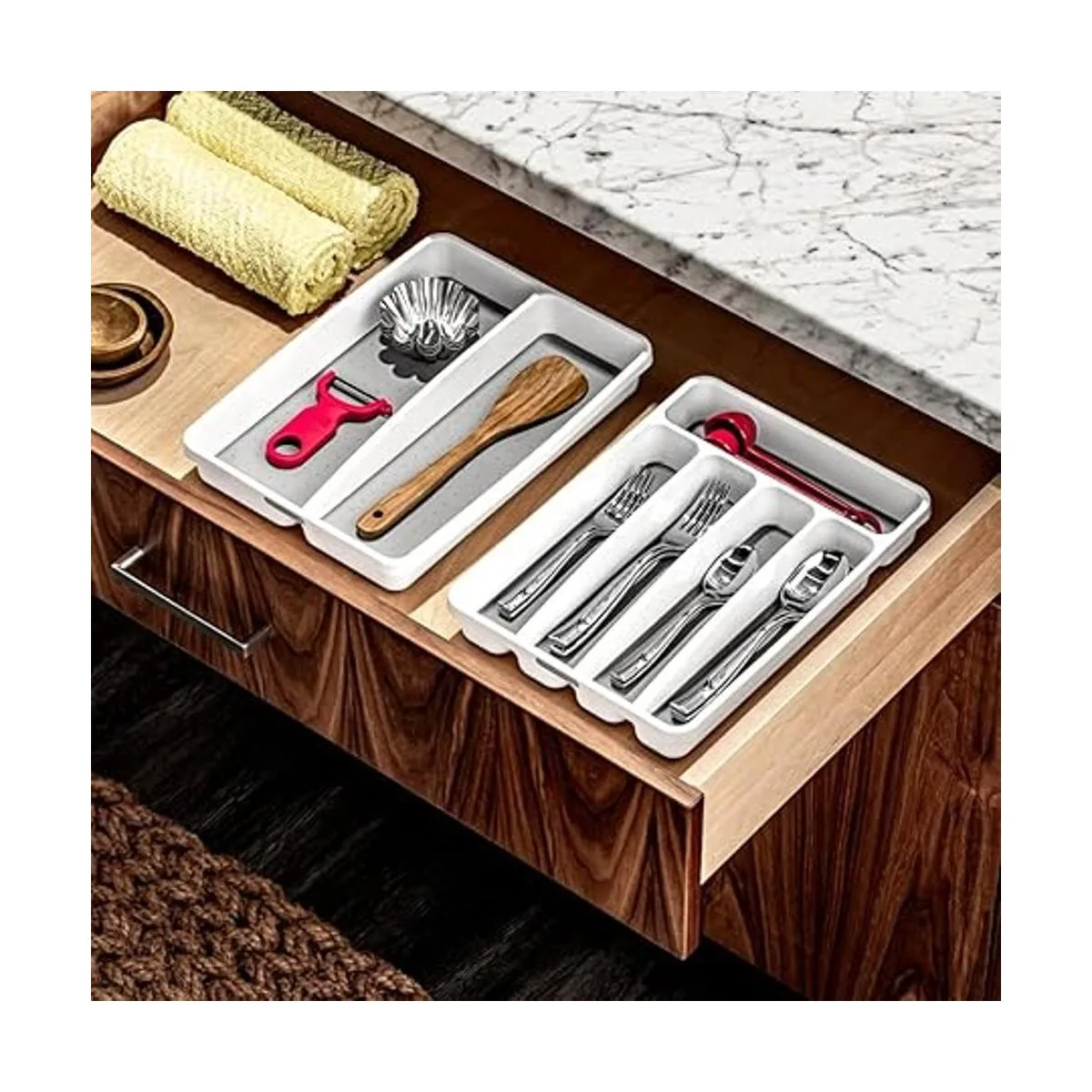 Las esquinas redondeadas y el forro de agarre suave hacen que esta bandeja de cubiertos sea altamente funcional, fácil de limpiar y estéticamente agradable