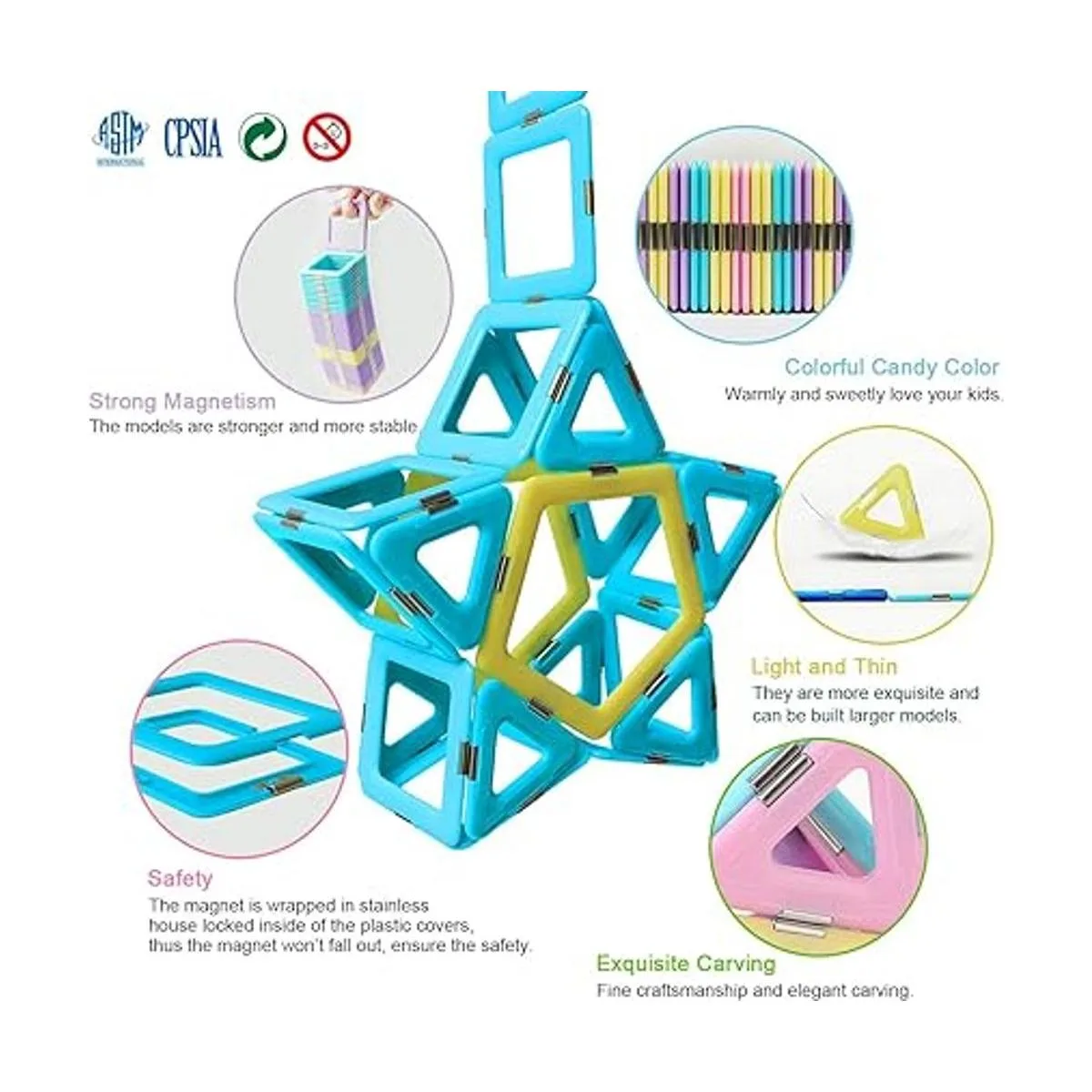 Juego clásico: el juego clásico de 52 bloques magnéticos de segunda generación para aprendizaje preescolar incluye 25 cuadrados, 21 triángulos, 6 semicírculos, 1 hermosa caja de regalo, 1 manual de color con muchos modelos de referencia, 1 tarjeta de garantía.