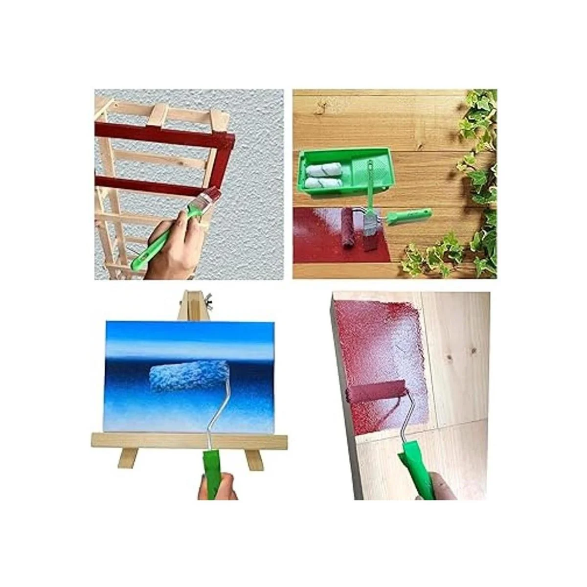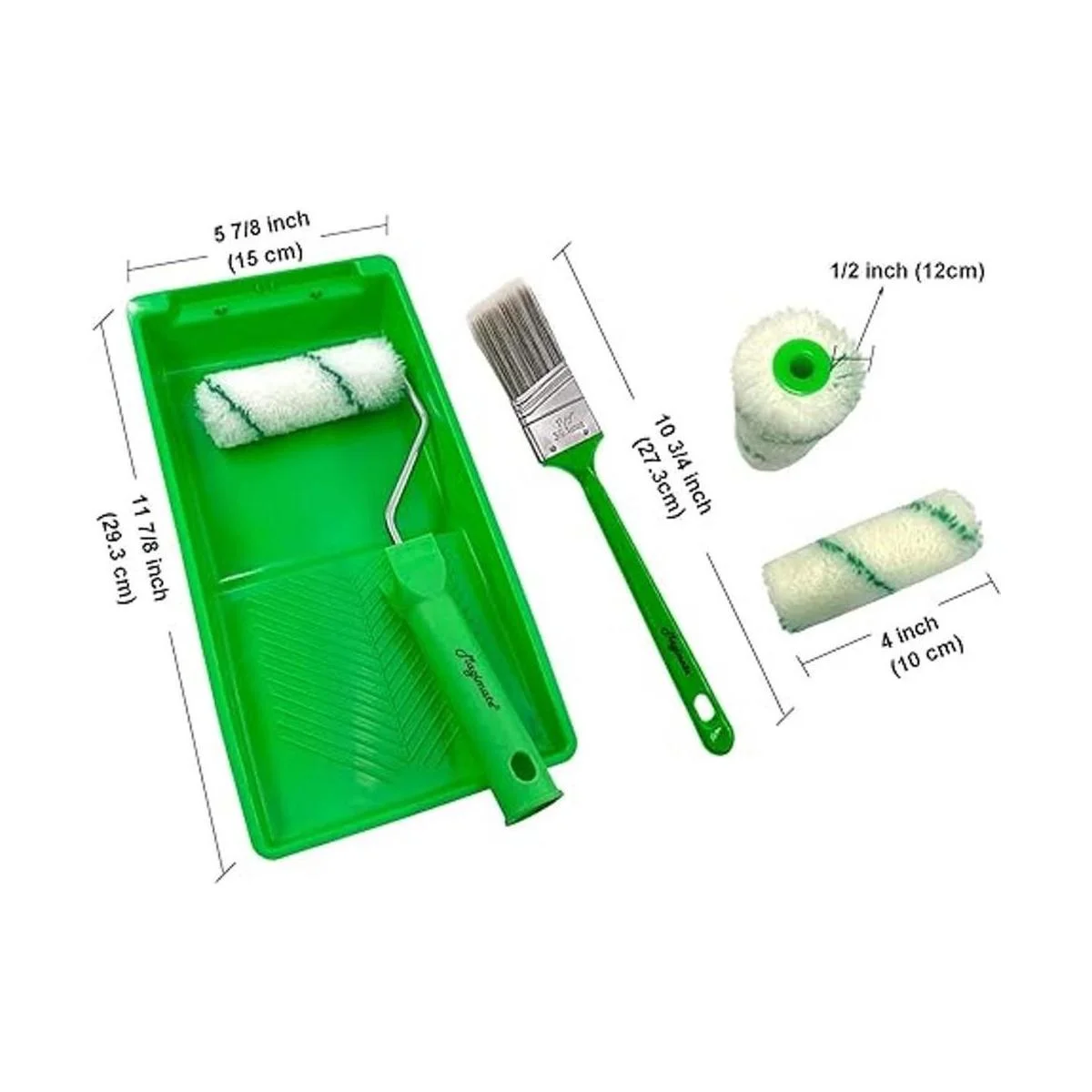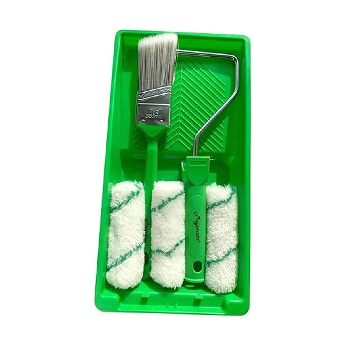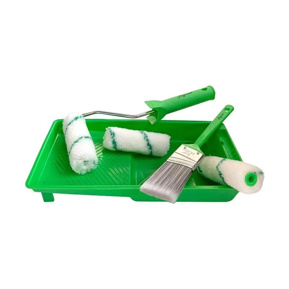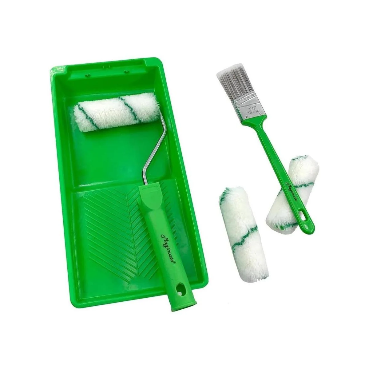 El mini kit de rodillo de pintura contiene: 3 rodillos de pintura, 1 marco de rodillo, 1 bandeja de pintura, todos de 4 pulgadas de ancho y 1 pieza de pincel de pintura angular de 1 1/2 pulgadas.