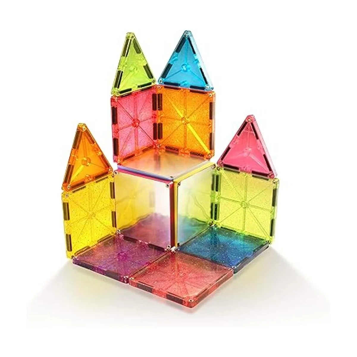 Incluido en este juego de azulejos MagnaTiles de expansión hay pequeños cuadrados purpurina y espejo y triángulos equiláteros colores tradicionales sin efectos añadidos