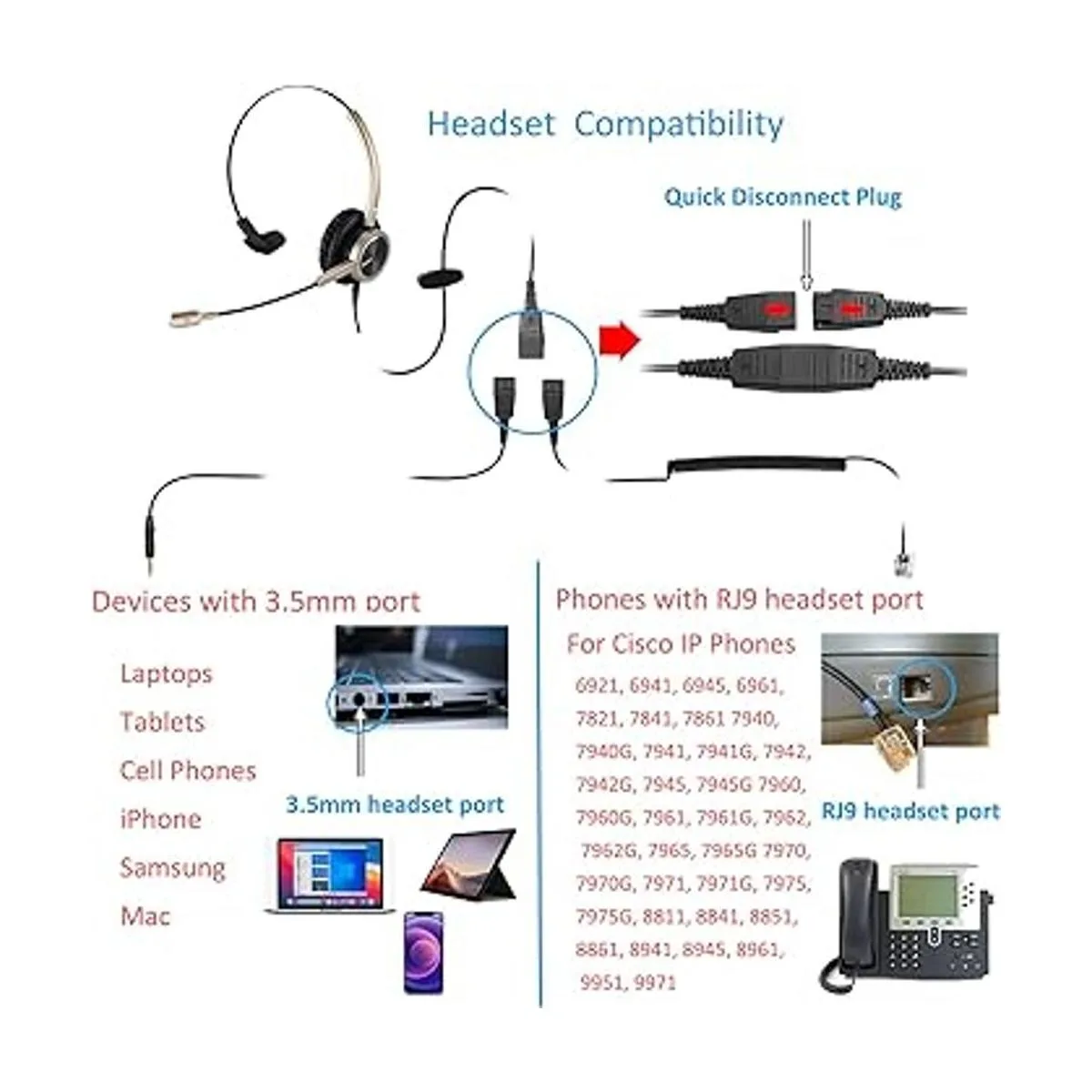 Un auricular para múltiples dispositivos. Estos auriculares de oficina vienen con conectores RJ9 y 0.138 in tanto para teléfonos de escritorio fijos, teléfonos celulares como portátiles de PC. Con conector de 0.138 in para iPhone, Samsung, PC, portátil y la mayoría de otros Android. Con conector RJ9 funciona para Cisco IP Phone 7931G 7940 7940G 7941 7941G 7942 7942G 7945 7945G 7960 7960G 7961 7961G 7962 7962G 7965 65G 79 70 7970G 7971 7971G 7975 7975G 6921 6941 6945 6961 7821 7841 7861 8811 8841 8961 9951 y más.