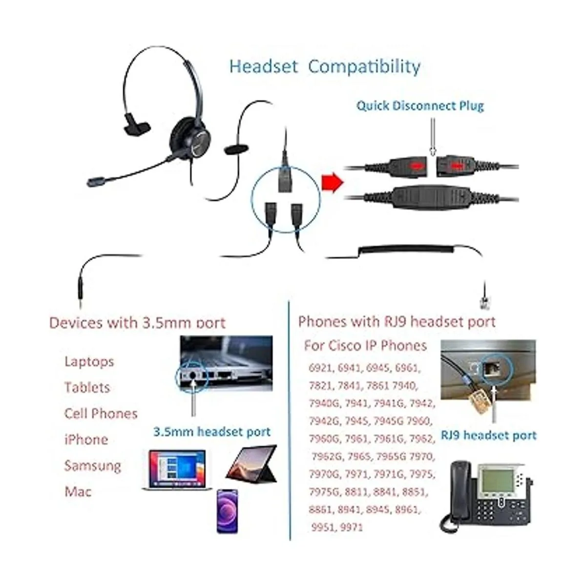 Un auricular para múltiples dispositivos. Estos auriculares de oficina vienen con conectores RJ9 y 0.138 in tanto para teléfonos de escritorio fijos, teléfonos celulares como portátiles de PC. Con conector de 0.138 in para iPhone, Samsung, PC, portátil y la mayoría de otros Android. Con conector RJ9 funciona para Cisco IP Phone 7931G 7940 7940G 7941 7941G 7942 7942G 7945 7945G 7960 7960G 7961 7961G 7962 7962G 7965 65G 79 70 7970G 7971 7971G 7975 7975G 6921 6941 6945 6961 7821 7841 7861 8811 8841 8961 9951 y más.