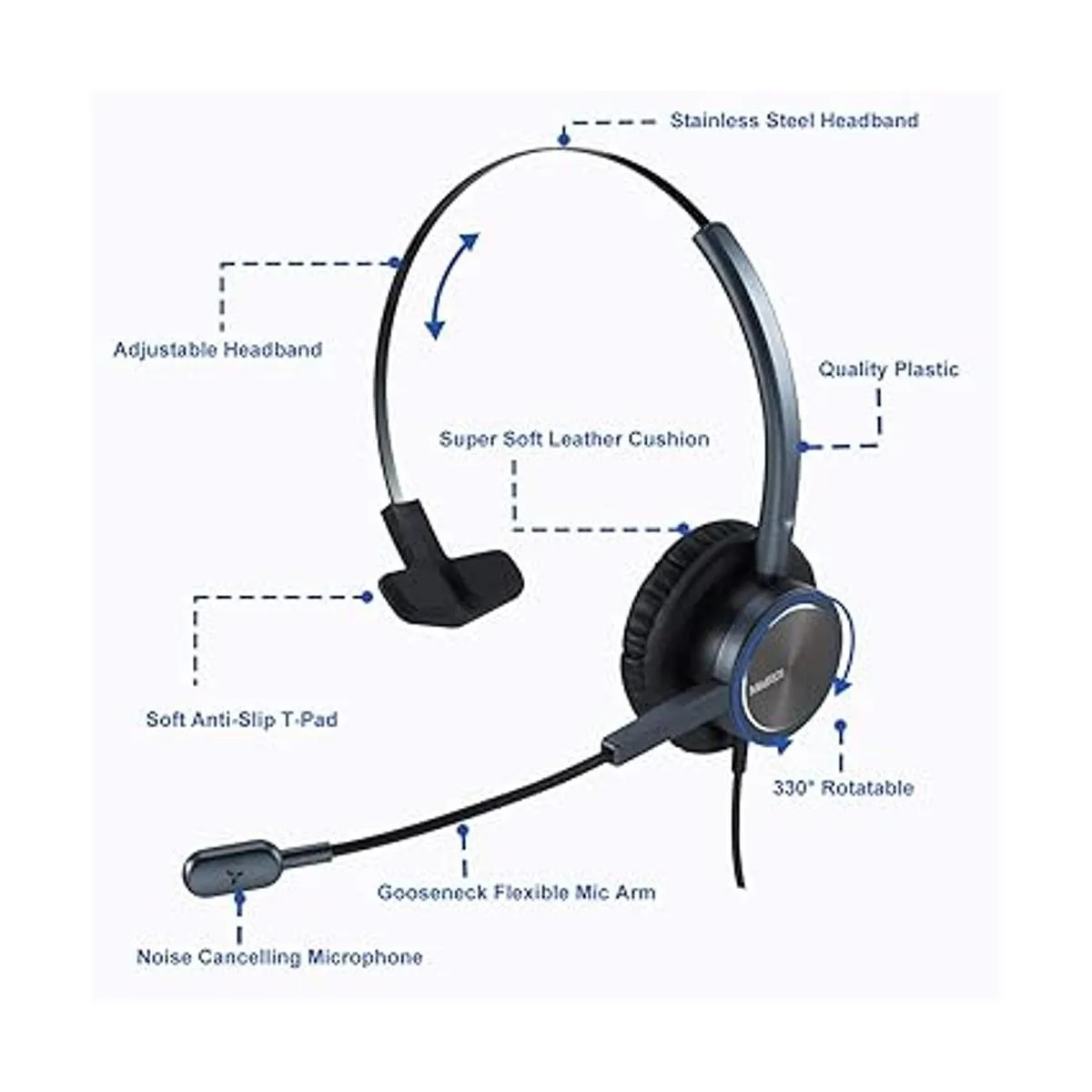 Auriculares súper cómodos: auriculares RJ9 con almohadilla de piel sintética súper suave, higiene fácil de usar, diadema ajustable para adaptarse a diferentes tamaños de cabeza, cubierta de oreja giratoria, sin dolor, sin empuje a las orejas durante todo el día. Brazo de micrófono giratorio de 330 grados para llevar micrófono en ambos lados, auriculares de centro de llamadas para telemarketing y oficinas.