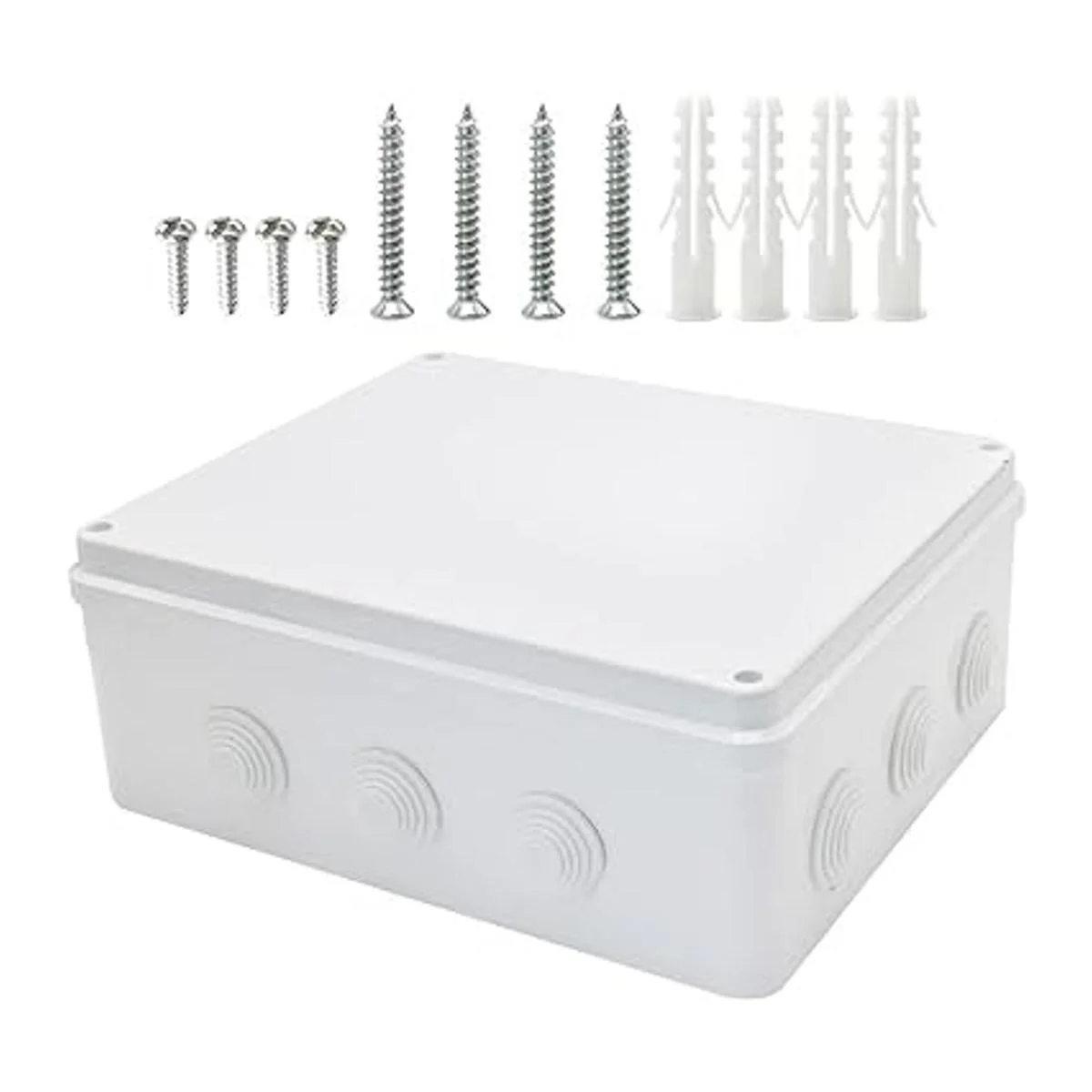 Contenido del paquete: 1 caja de conexiones impermeable, 4 tornillos, 4 pernos de expansión. Material de la caja eléctrica: goma ABS. Peso neto: 32.31 oz