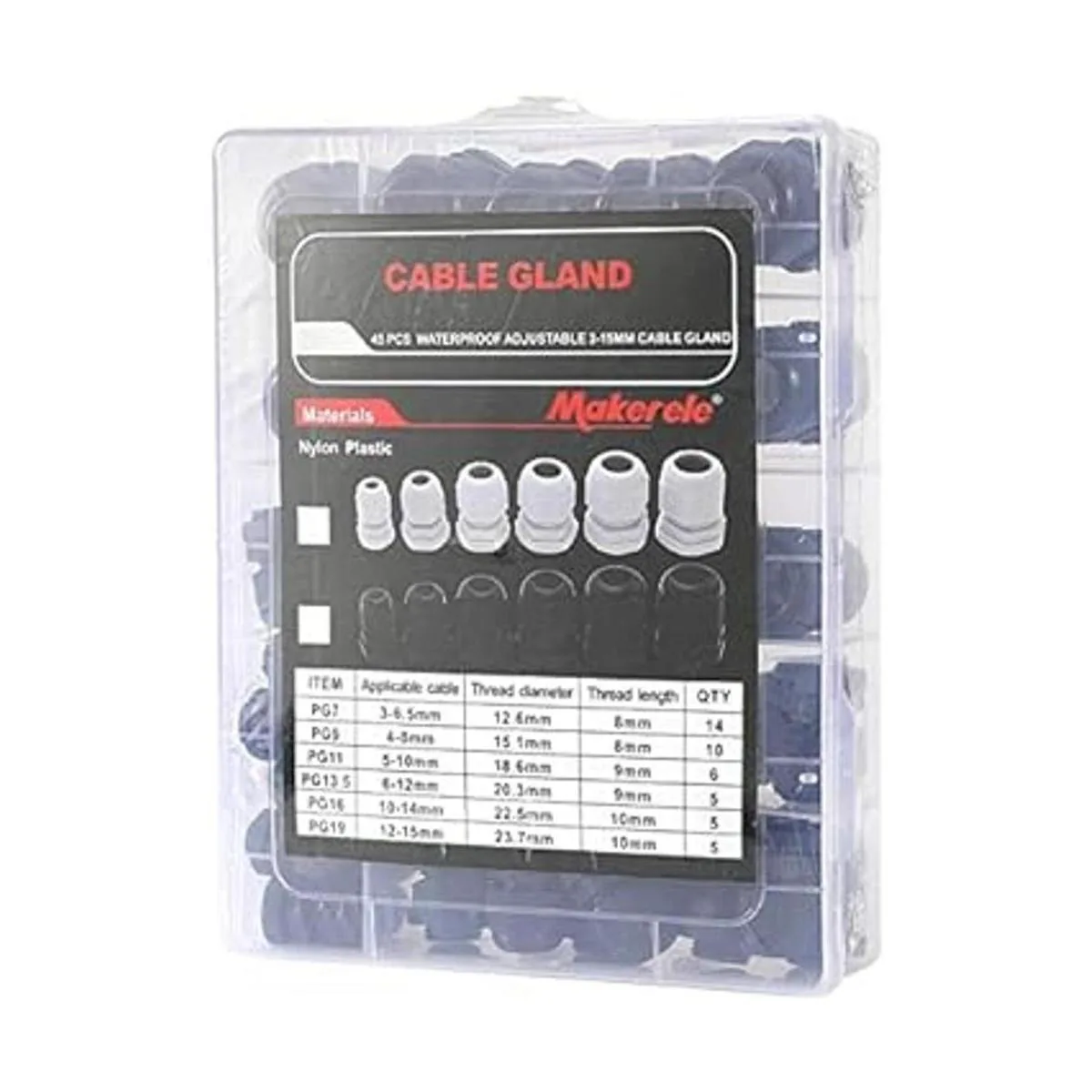 MAKERELE Juego de 45 prensaestopas de plástico impermeable ajustable de 3 a 0.591 in, color negro