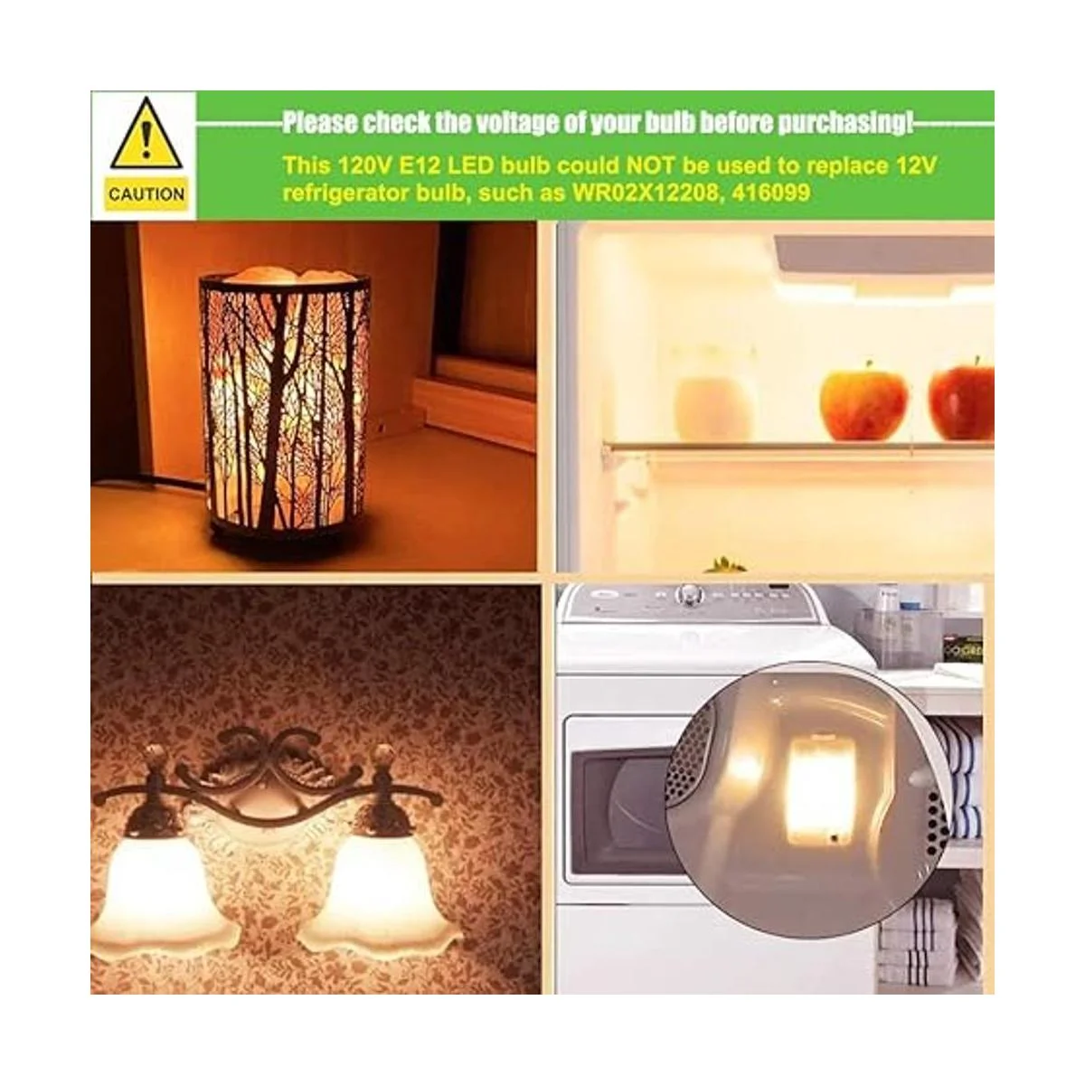 Consejo importante: esta bombilla LED E12 no es regulable, lo que no podría funcionar en el regulador que podría causar un parpadeo incómodo. Solo tiene 1 nivel de brillo. Además, esta bombilla LED E12 de 120 V no se puede utilizar para reemplazar bombillas de refrigerador de 12 V, como WR02X12208, 416099. Además, esta bombilla no se puede utilizar para reemplazar la bombilla de refrigerador W11160686, que es base europea.