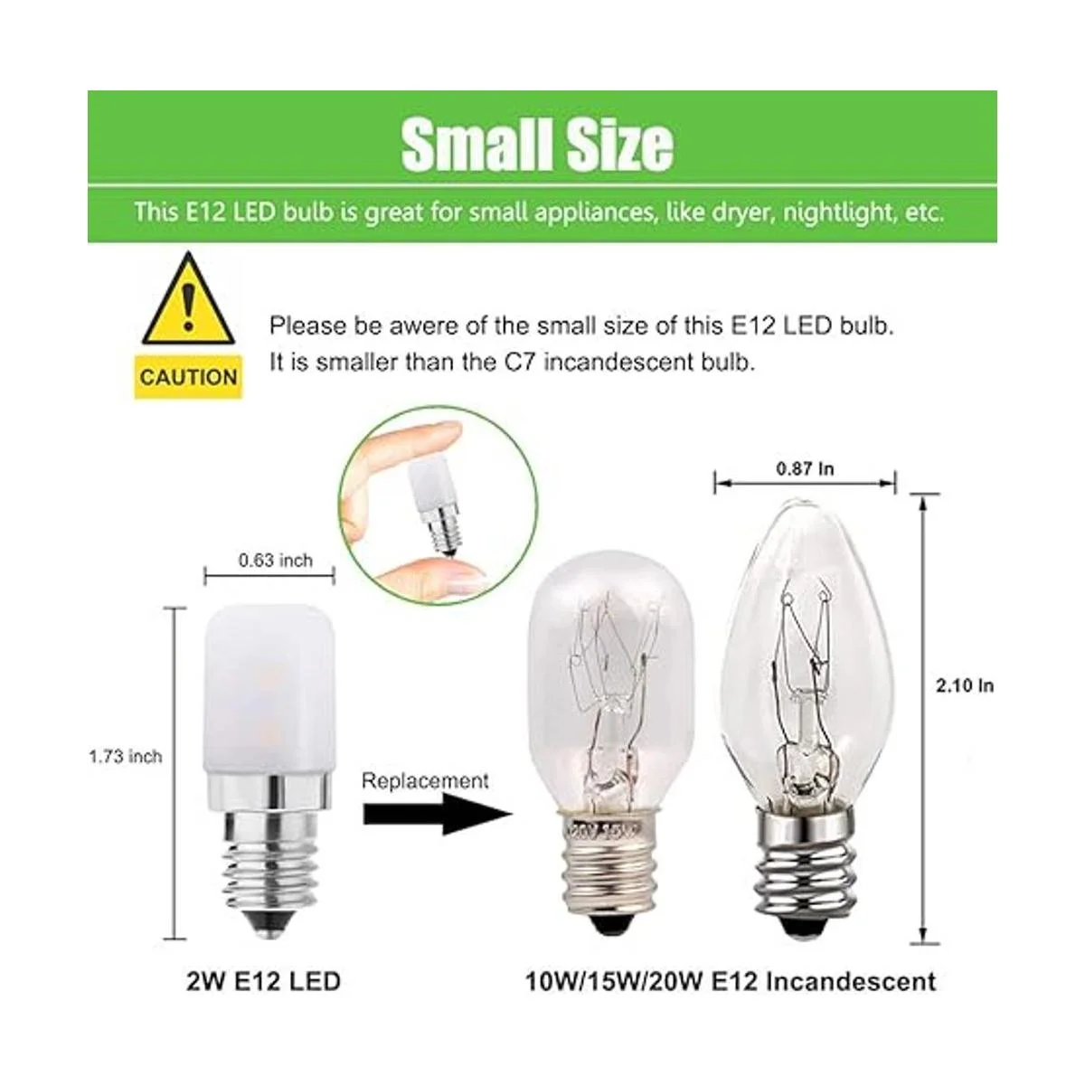 Tamaño compacto y fácil instalación. Plug and Play. El tamaño compacto es ideal para las lámparas con pequeña carcasa de luz. N: es una base de tornillo de candelabro E12, entrada de CA de 120 V. Consejo: ten en cuenta el pequeño tamaño de esta bombilla LED E12, que es más pequeña que la bombilla incandescente C7.