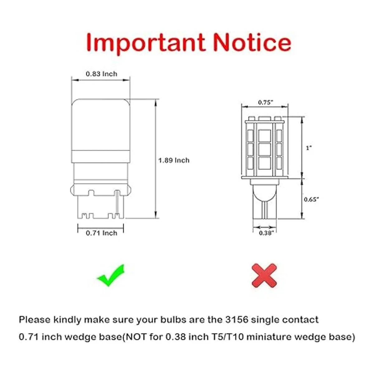 Nota importante sobre la base. Asegúrate de que tus bombillas son la base de cuña de 0,71 pulgadas de contacto individual 3156 no para base de cuña en miniatura de 0,38 pulgadas o base de contacto doble. La medición se muestra en la imagen. Para bombillas LED T5 T10 en miniatura, busca ASIN B0797R11PZ.