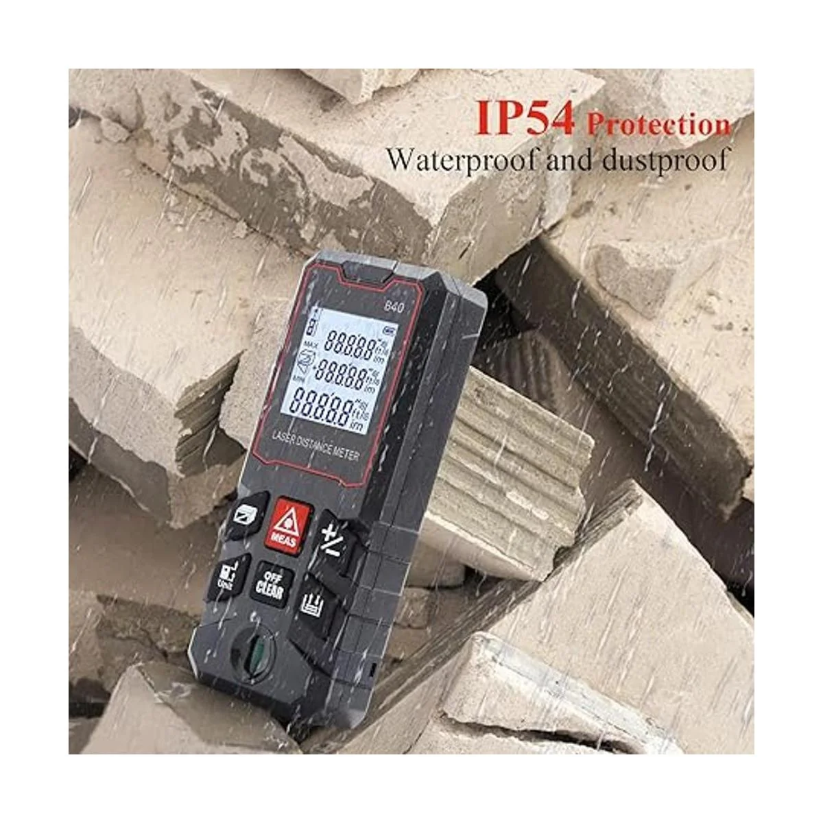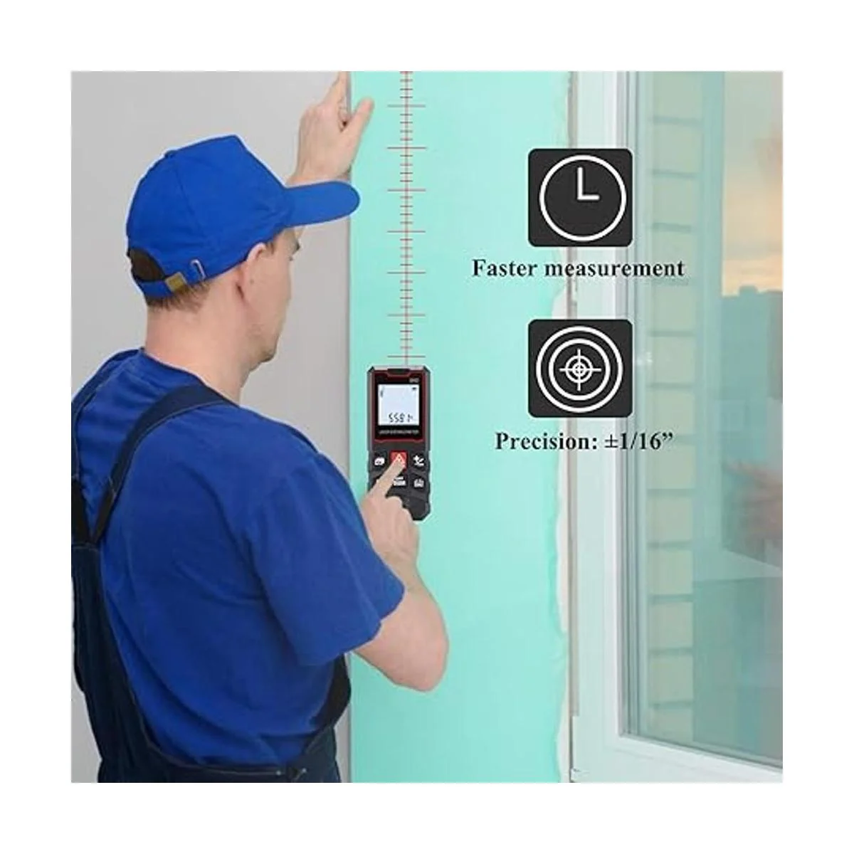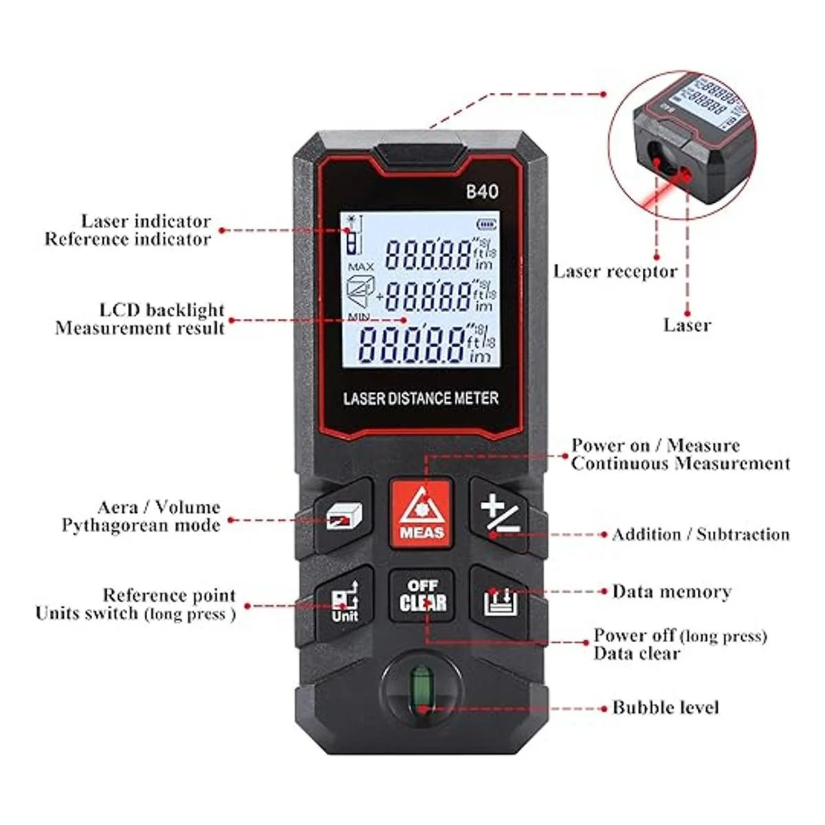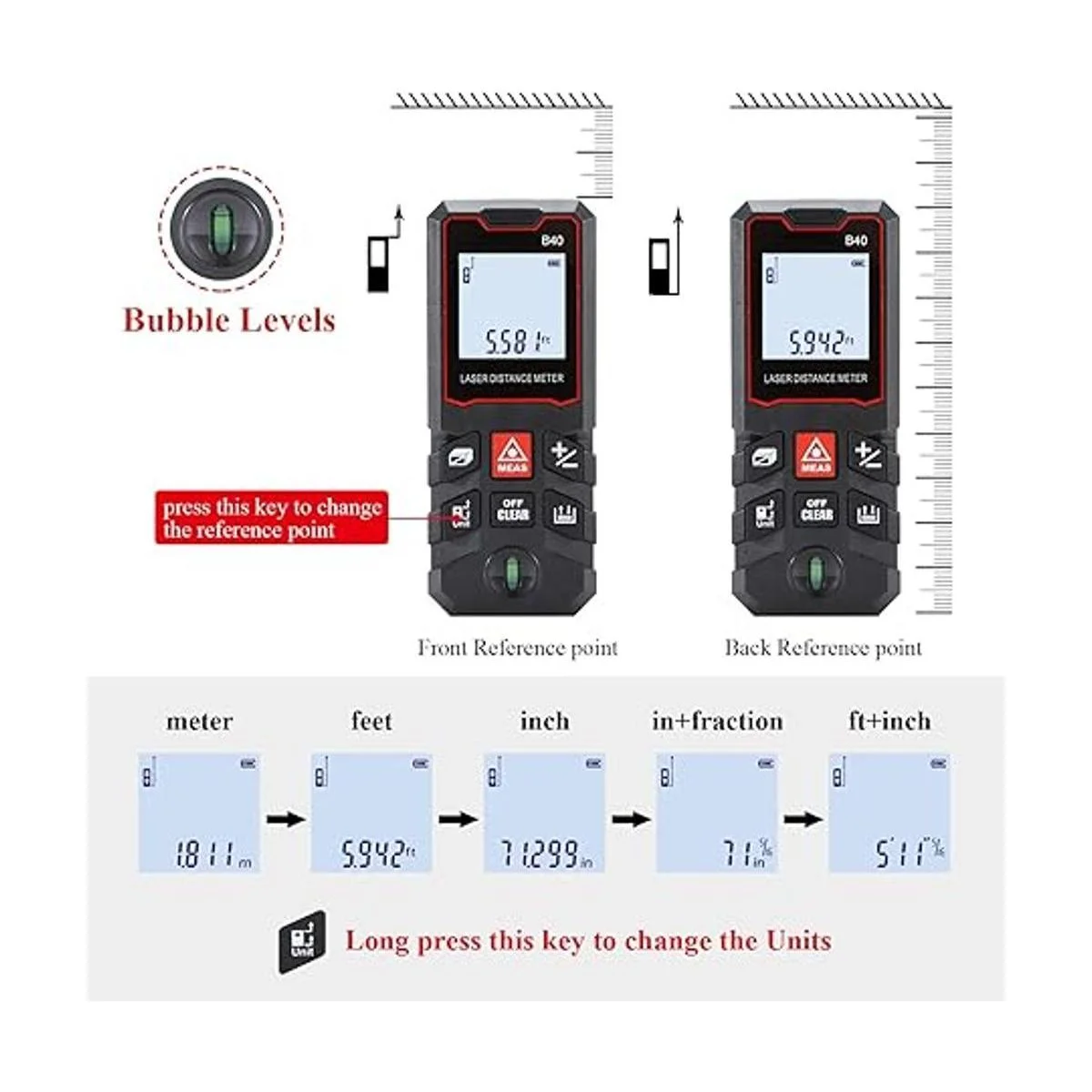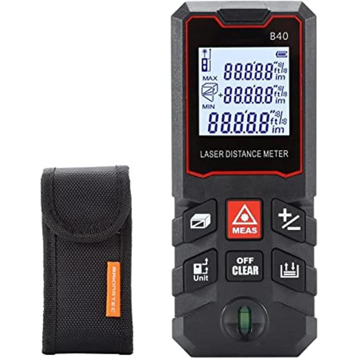 MAKINGTEC Medida láser de 131 pies, interruptor de unidad de piesinM, cinta métrica láser digital con herramienta de medición láser de nivel de burbuja, medida de distancia láser retroiluminada LCD, área de modo pitagórico y medición de volumen