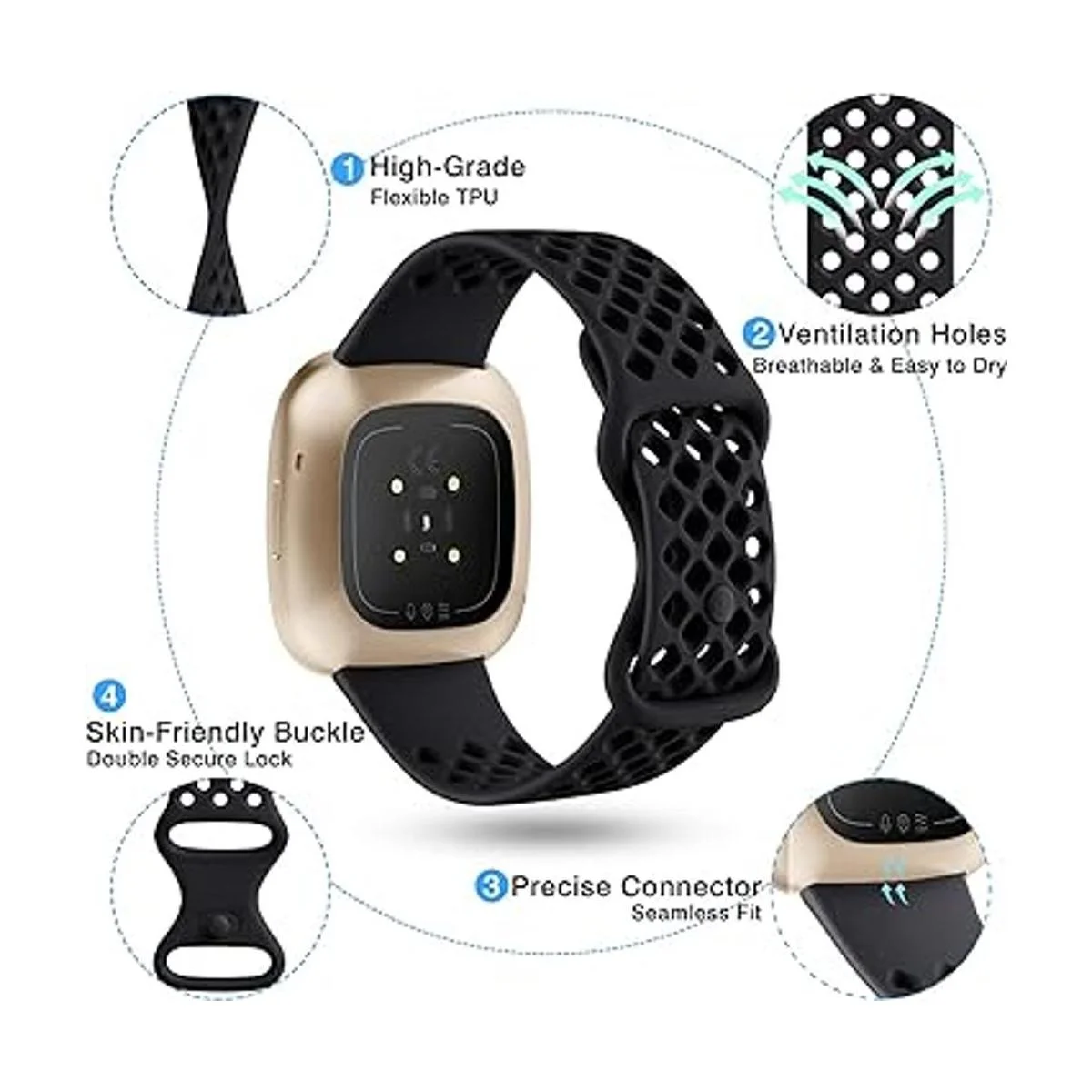 Material impermeable de alta calidad: las correas Maledan compatibles con Fitbit Versa 3 y Versa 4 y Sense 2 y Sense están hechas de TPU de alta calidad en diseño de agujeros de ventilación, listas para nadar y fáciles de secar, evitan la irritación de la piel; suave, ligero, más transpirable y cómodo de llevar