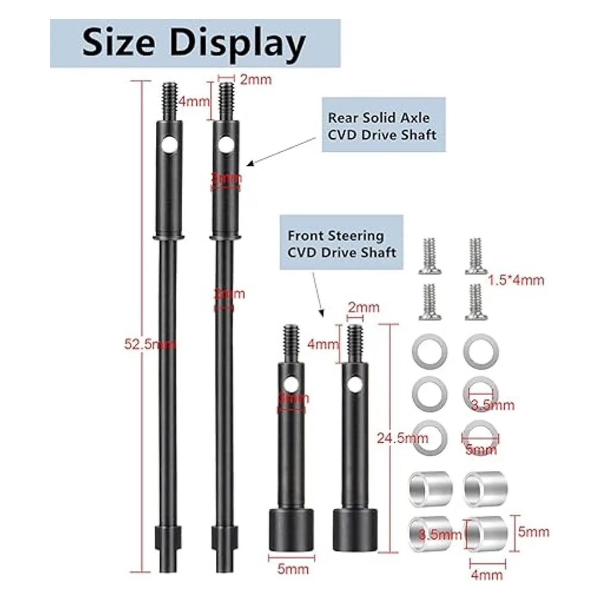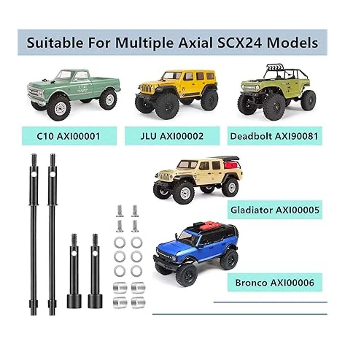 Ejes extendidos SCX24 compatibles con: el eje de transmisión SCX24 es compatible con 1/24 SCX 24 AXI90081 Deadbolt AXI0005 AXI0006 AXI0001 AXI0002 RC Vehículo. Juego de ejes de transmisión de vehículos RC El paquete incluye: 2 ejes de transmisión CVD de dirección delantera y algunos accesorios como se muestra