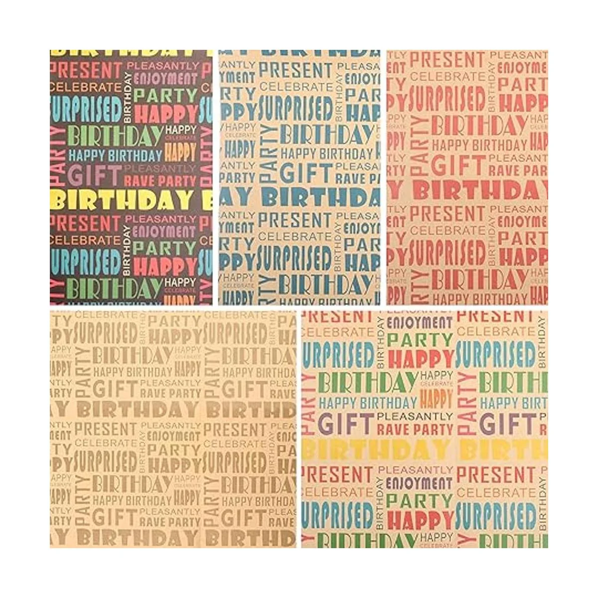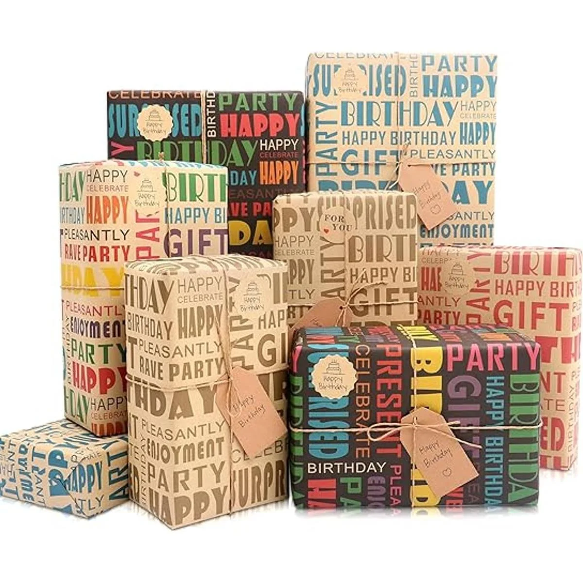MAMUNU 10 hojas de papel de regalo de feliz cumpleaños, papel de regalo de letras coloridas, papel de estraza marrón de 20 x 28 pulgadas con etiqueta de regalo, cuerda de papel y calcomanía de sellado para ocasiones de cumpleaños, envoltura de regalos de bricolaje