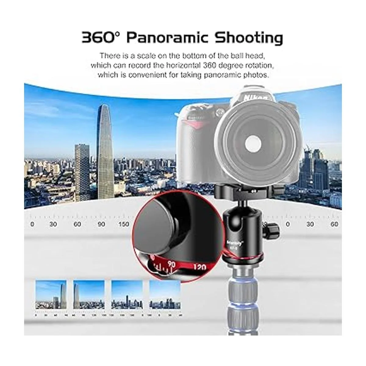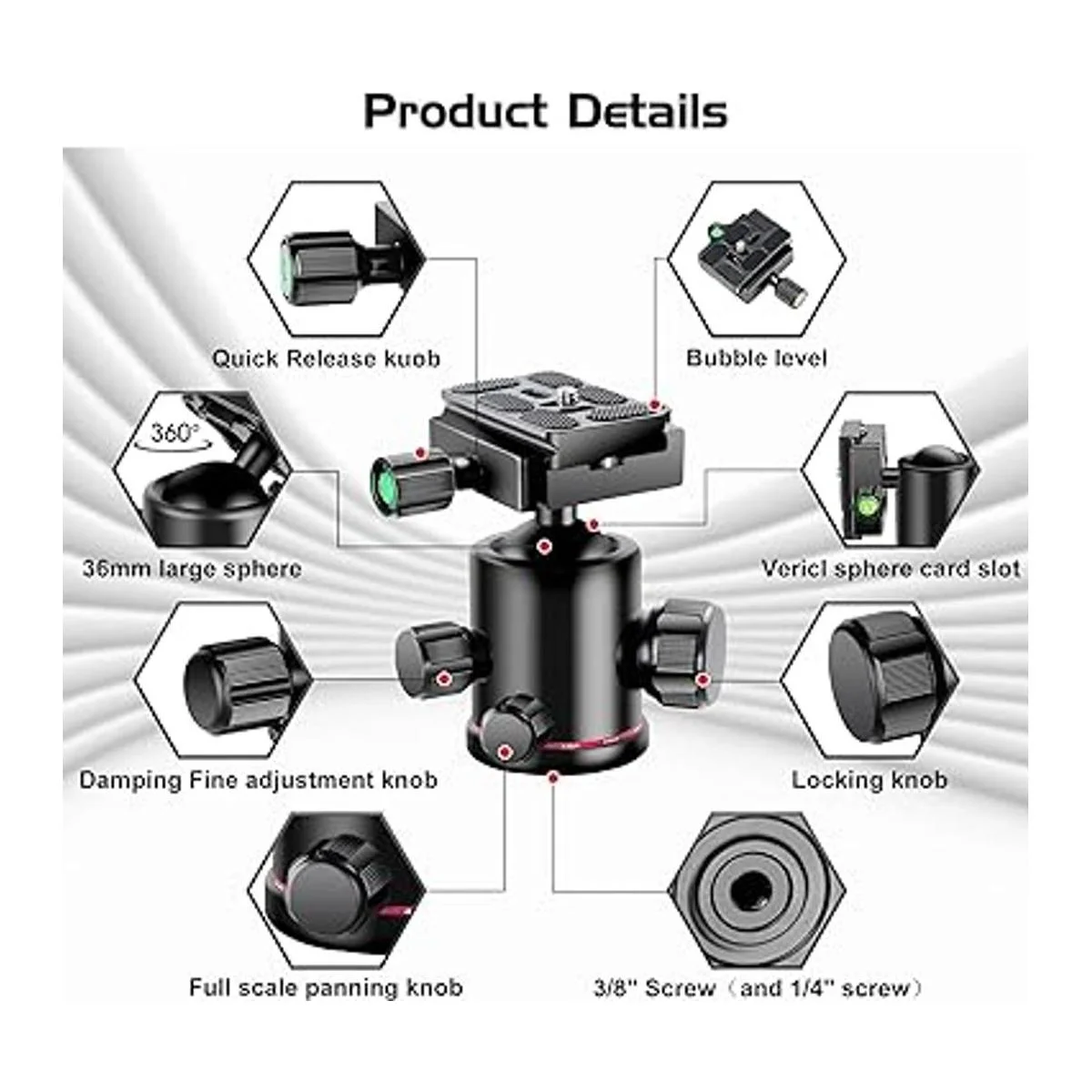 Diseño mejorado: el diámetro de la cabeza de bola del trípode es de 1.417 in y puede girar 360 grados. La cámara se puede ajustar a diferentes ángulos con la ayuda de 3 pomos de ajuste. Uno de los pomos se ha actualizado desde el diseño relativo hasta el diseño lateral, lo que es mejor para un trípode reflejado.