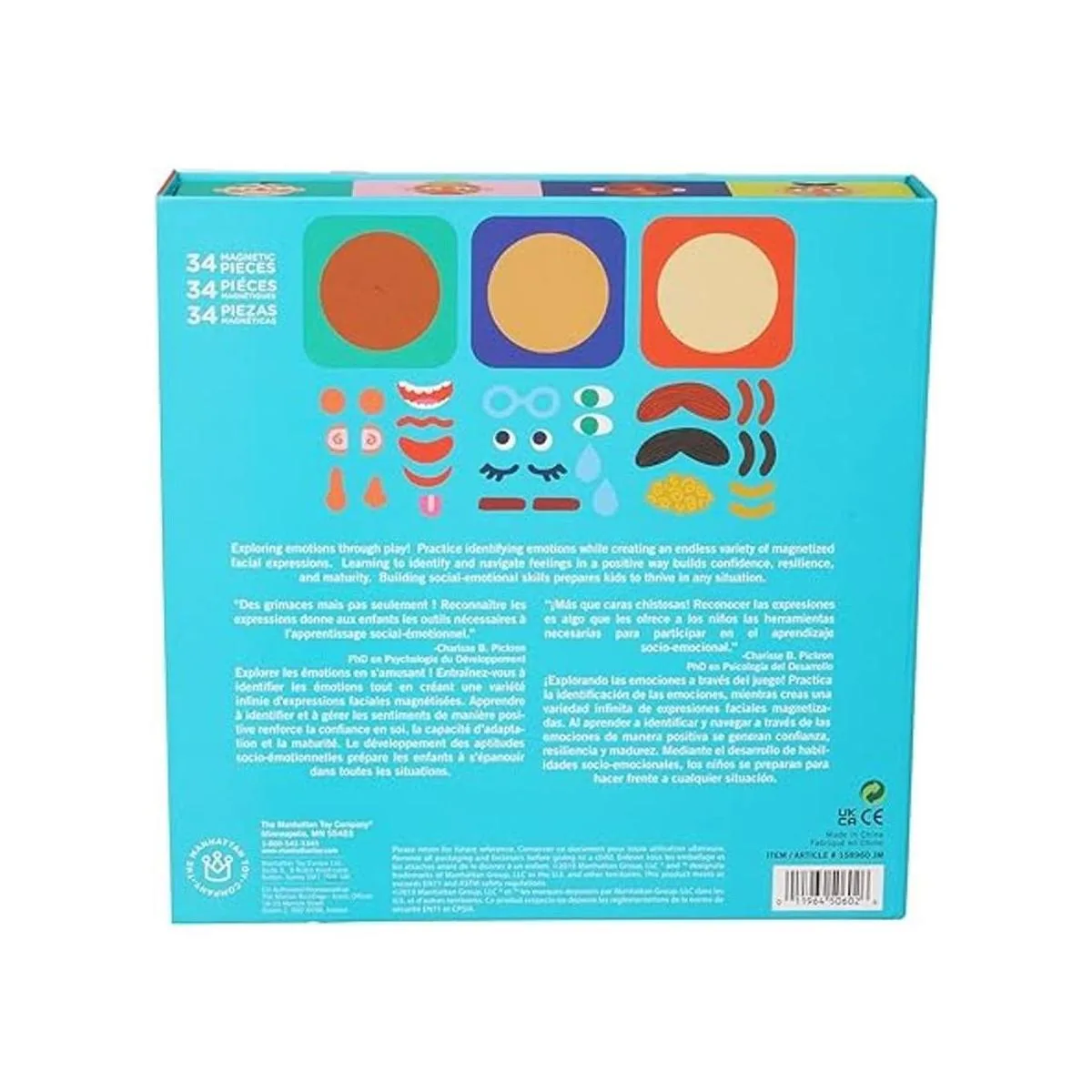 Detalles del juguete de emoción para hacer caras: este juego de 34 piezas incluye 3 tableros magnéticos para montar 31 piezas faciales magnéticas de perforación. Mezcla y combina las piezas para replicar ejemplos de expresión facial en la caja o haz que los niños creen propios. El juego cuenta con idiomas bilinges en inglés y francés.