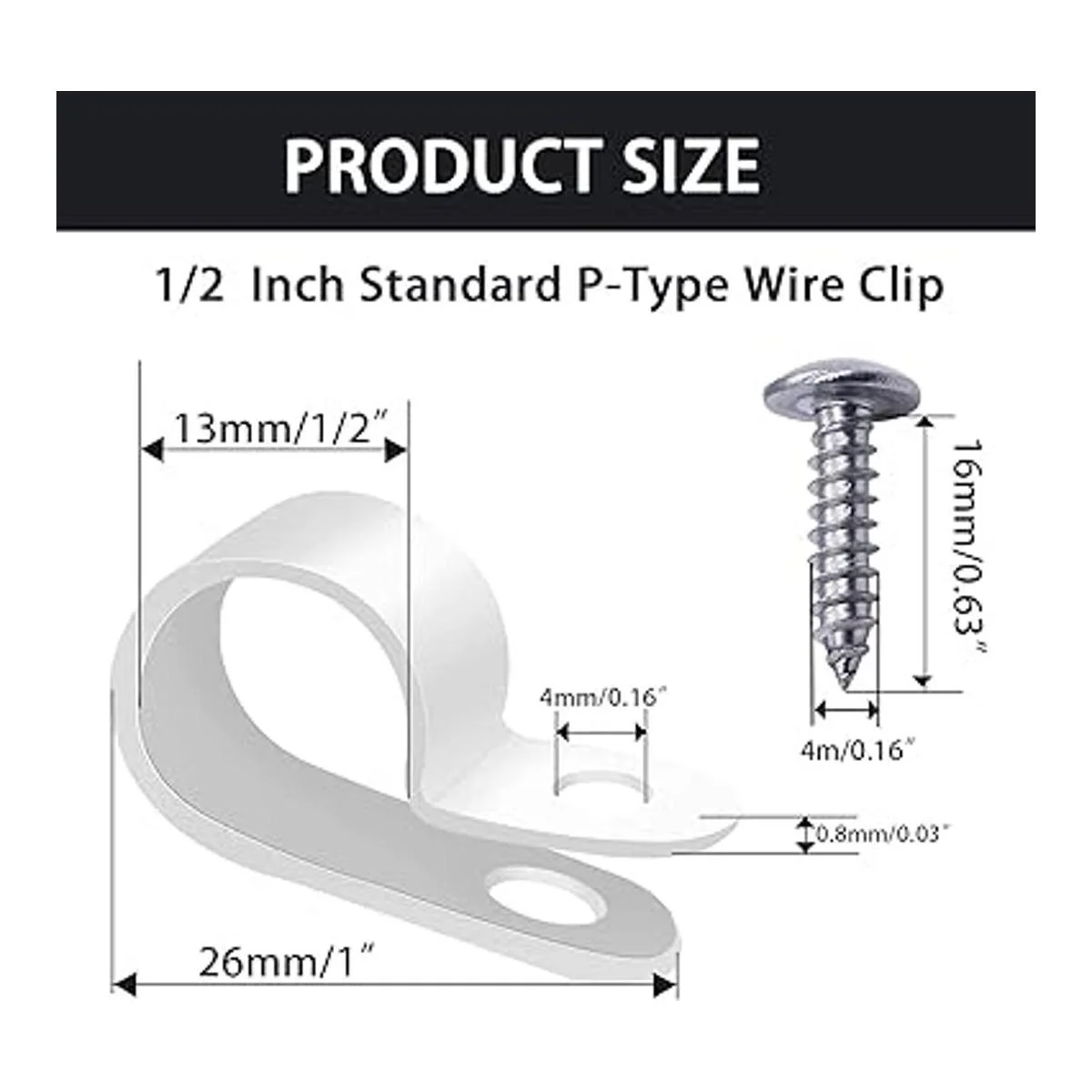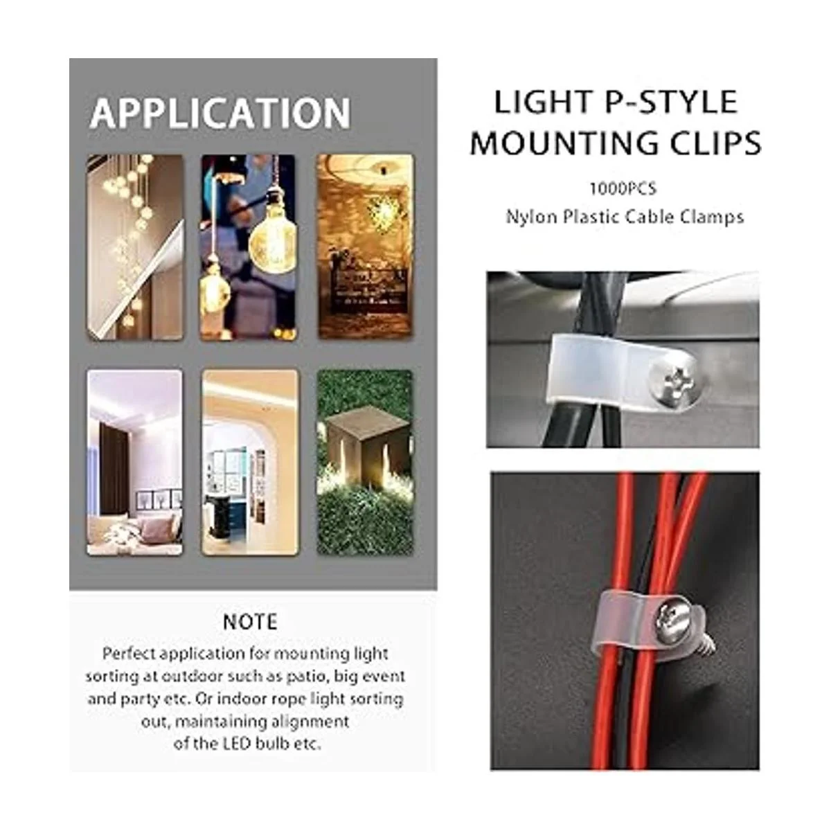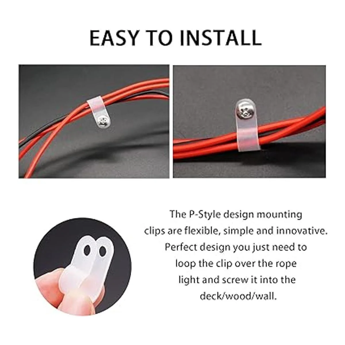 Fácil de usar Los clips de montaje de diseño P son flexibles, simples e innovadores. Diseño perfecto, solo tienes que colocar el clip sobre la cuerda de luz y atornillarlo en la cubierta/madera/pared.