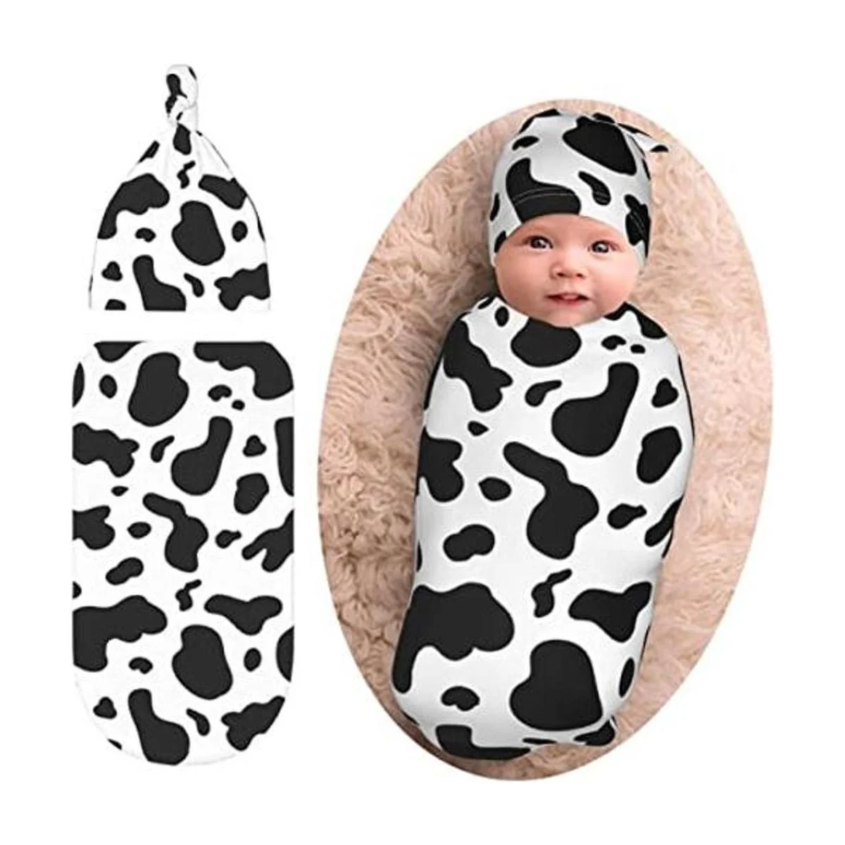 Manta de bebé con estampado de vaca para recién nacidos, juegos de gorros suaves y elásticos, manta de recepción de bebé, saco de envolver para baby shower, regalo para niños y niñas