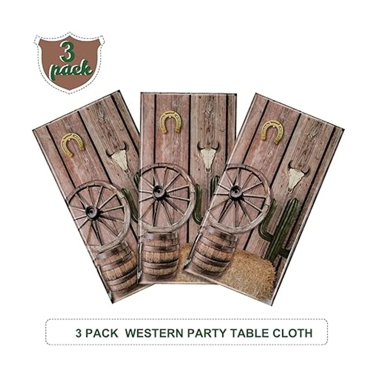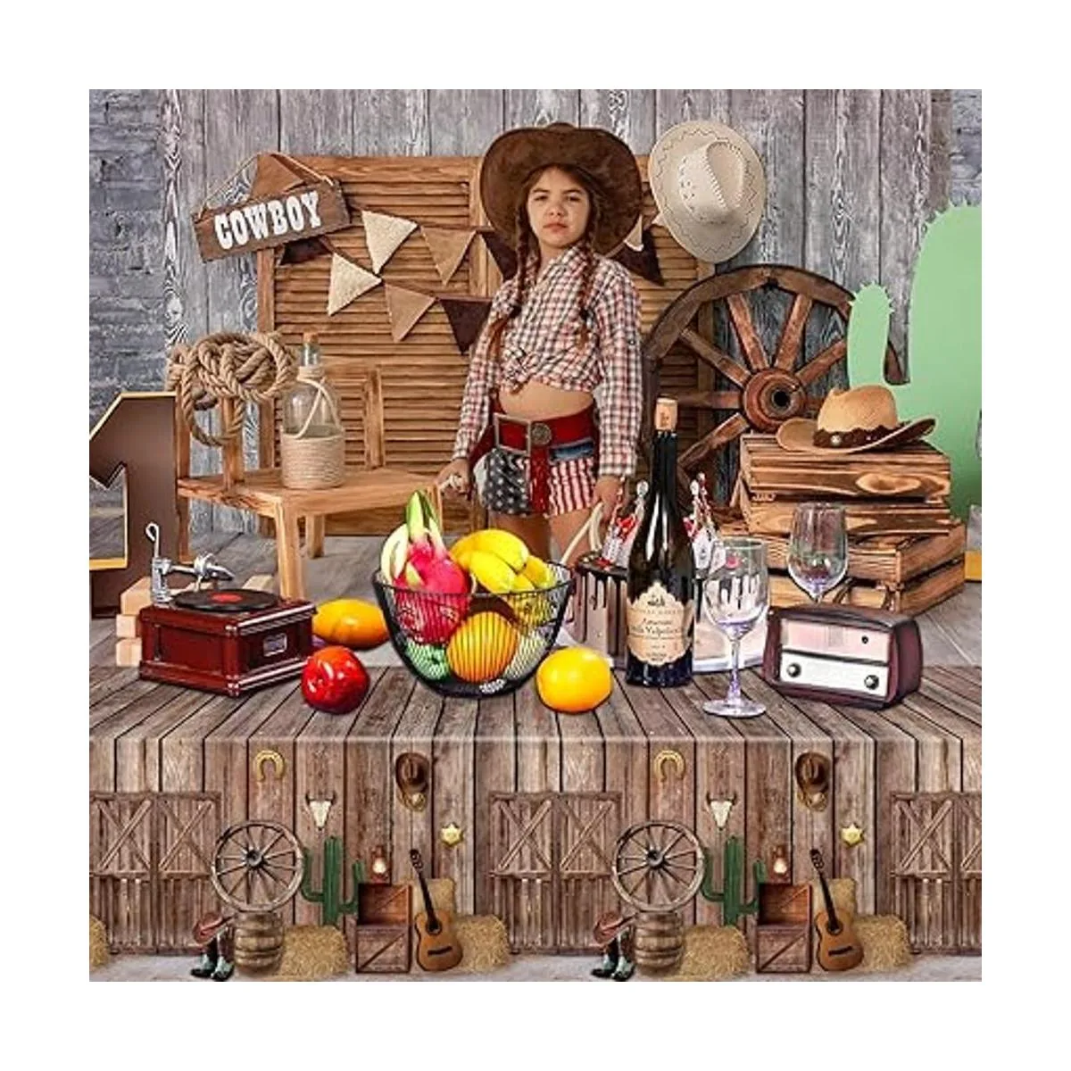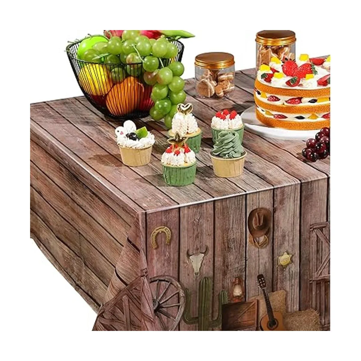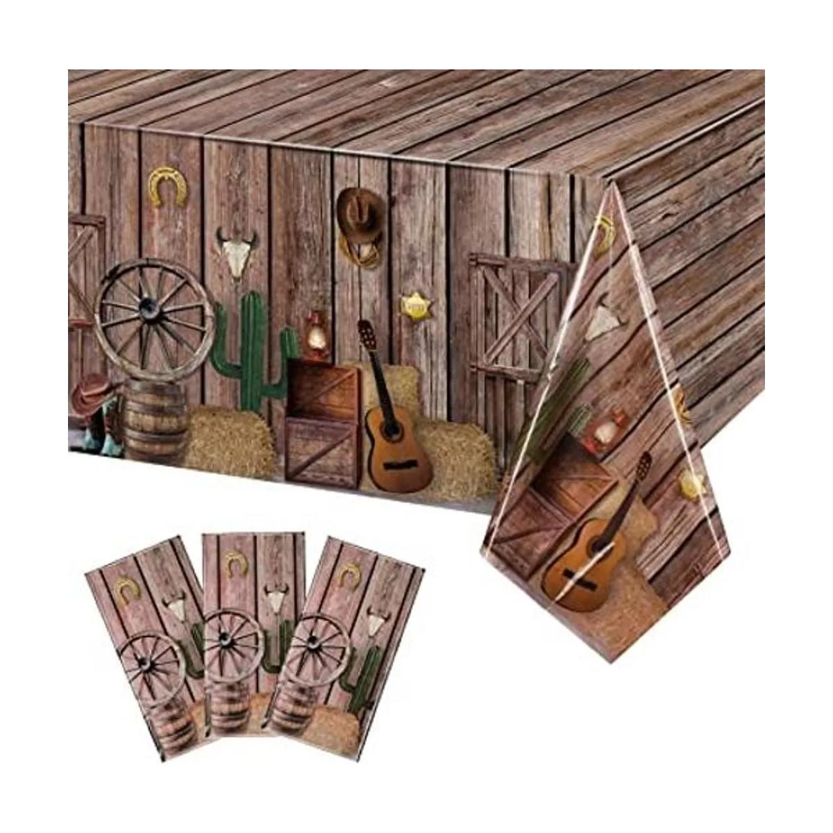 Mantel de fiesta occidental, cubierta de mesa de fiesta de vaquero occidental, mantel de plástico con temática de vaquero del salvaje oeste de madera para puerta de granero para baby shower, suministros de fiesta de cumpleaños 3