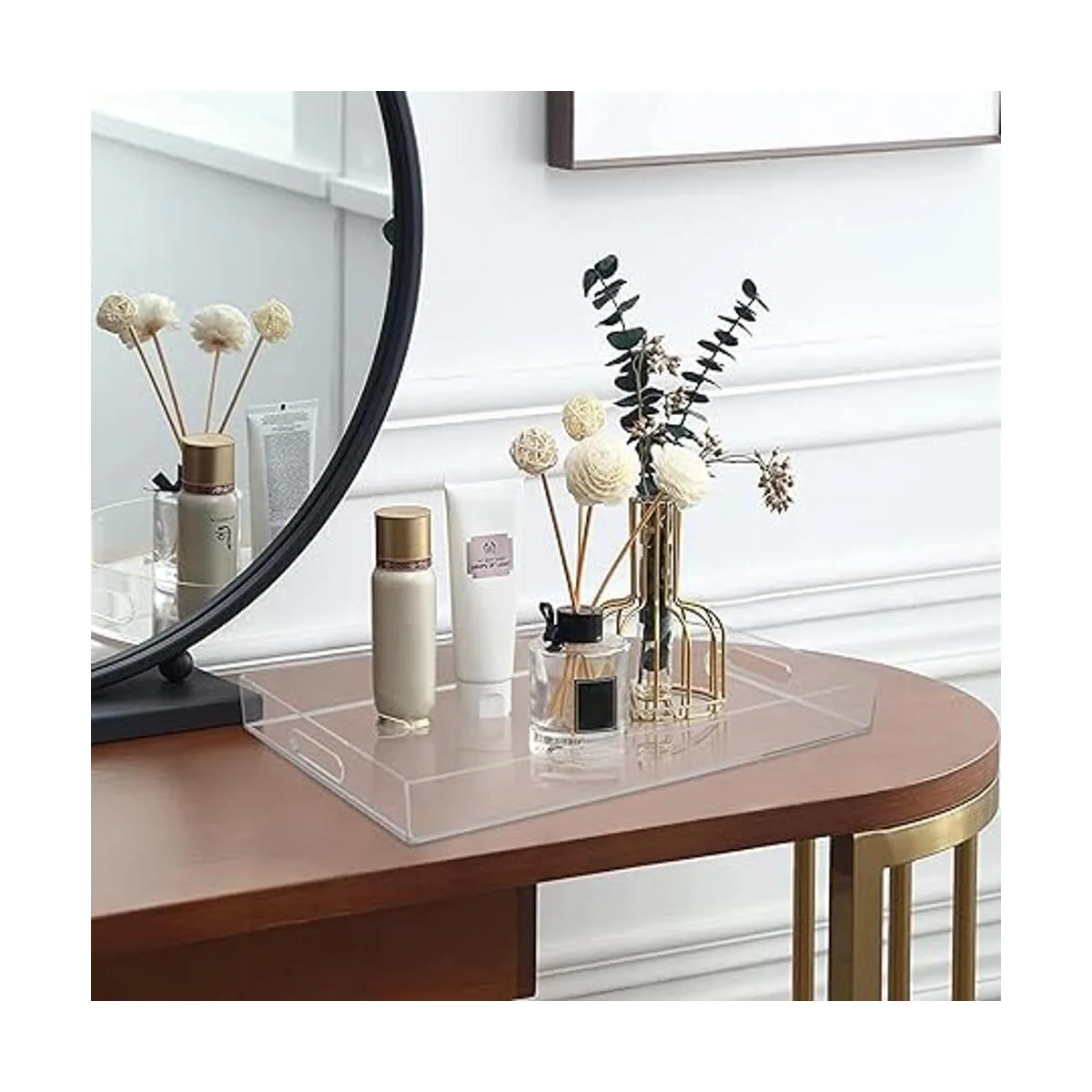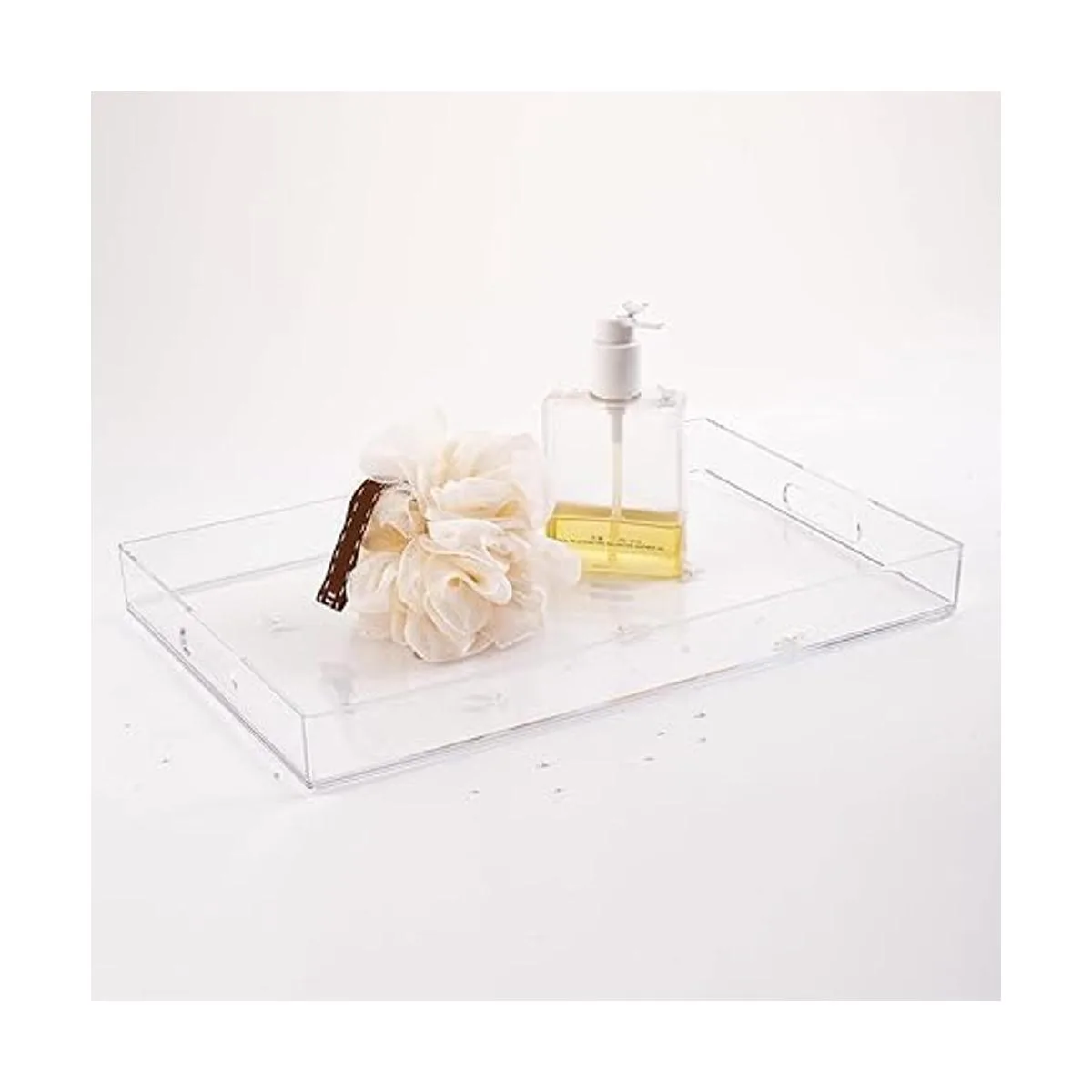 Decoración de bandeja: utiliza esta bandeja rectangular para servir como parte de un centro de mesa para la mesa de sala de estar o mesa de café, o colócala en tu tocador de baño como una exquisita exhibición para perfumes, joyas o accesorios de baño. Esta bandeja rectangular de plástico transparente puede brillar fácilmente en tus cosas, añadiendo un toque elegante y moderno.