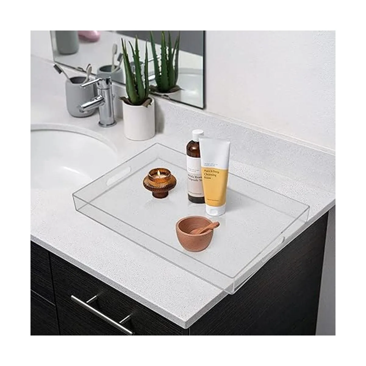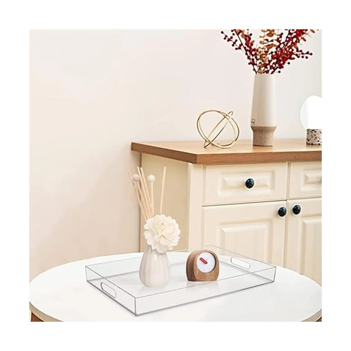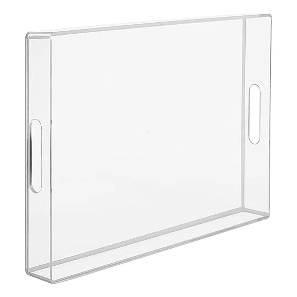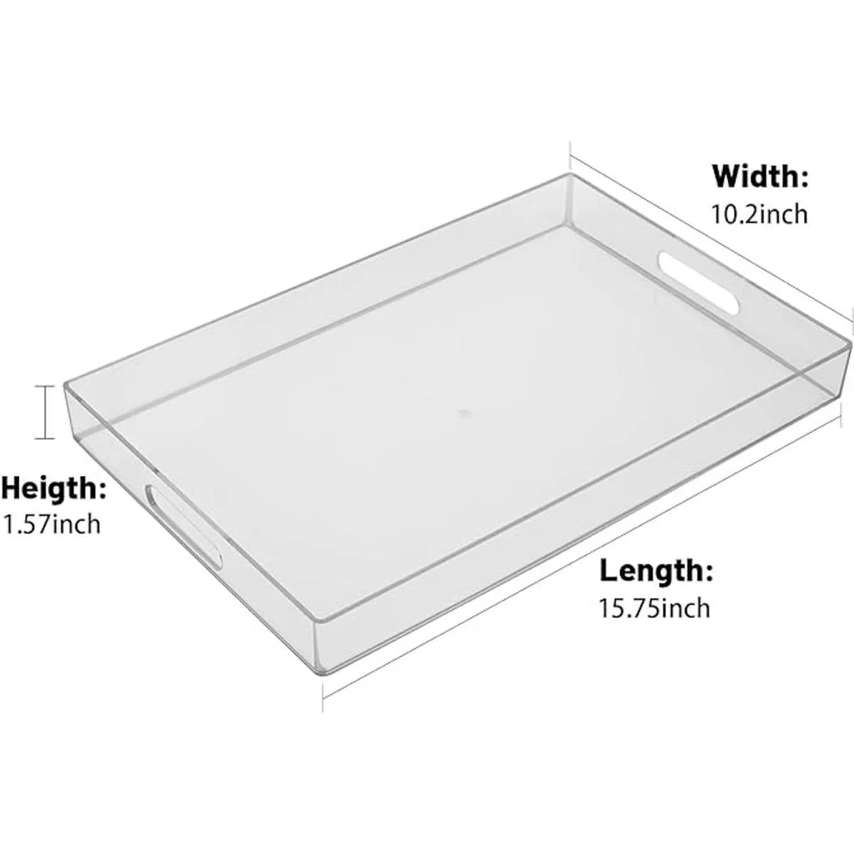 MAONAME Bandeja transparente para servir con asas, bandeja transparente de plástico, bandeja decorativa rectangular para mesa auxiliar, otomana, baño, tocador, 15.7 pulgadas de largo x 10.2 pulgadas de ancho x 1.57 pulgadas de alto