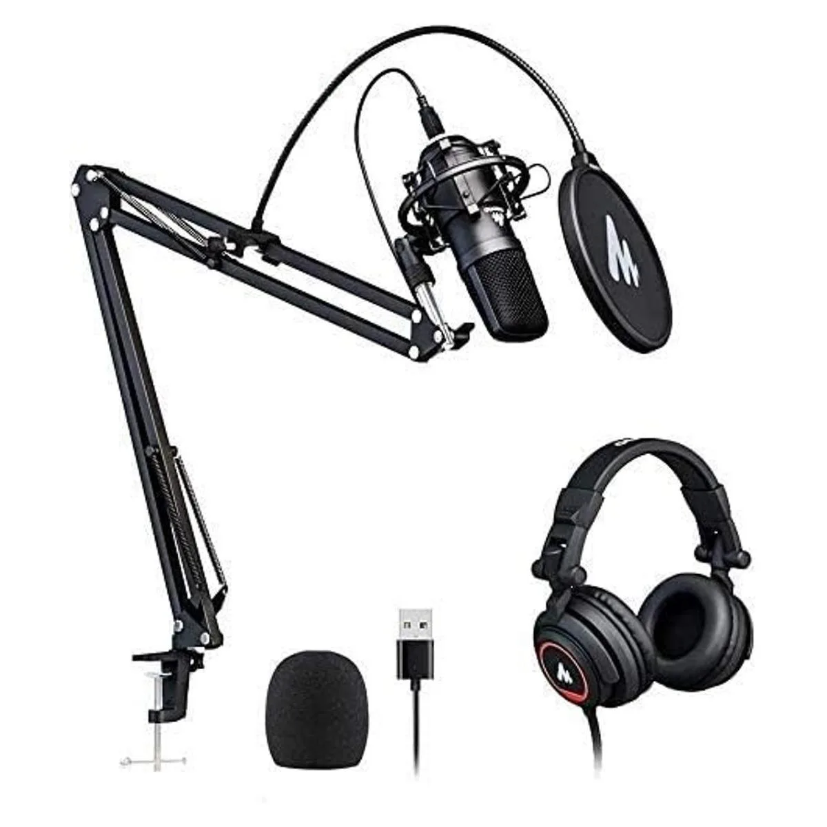 Contenido del paquete y garantía: Audífonos alambricos, micrófono de condensador Soporte de brazo de tijera ajustable Soporte de amortiguador de metal Filtro de pop Parabrisas de micrófono de espuma Abrazadera de montaje de mesa Cable USBB a USBA, adaptador de 3.5mm a 6.35 mm. Los productos de MAONO ofrecen 12 meses de garantía para garantizar una mejor experiencia de compra