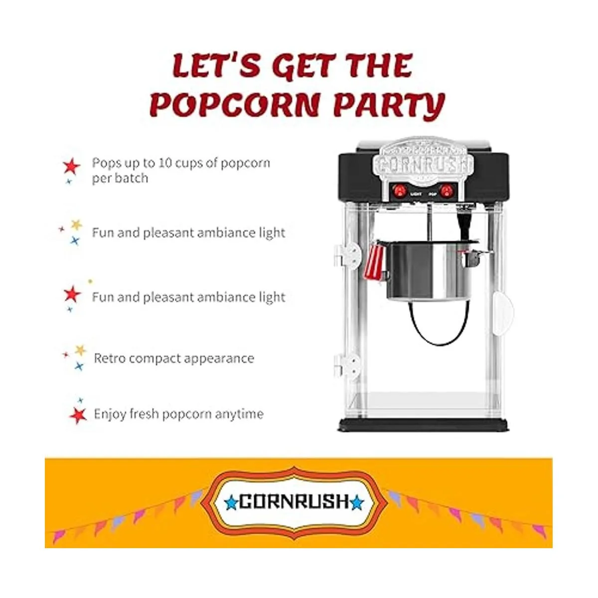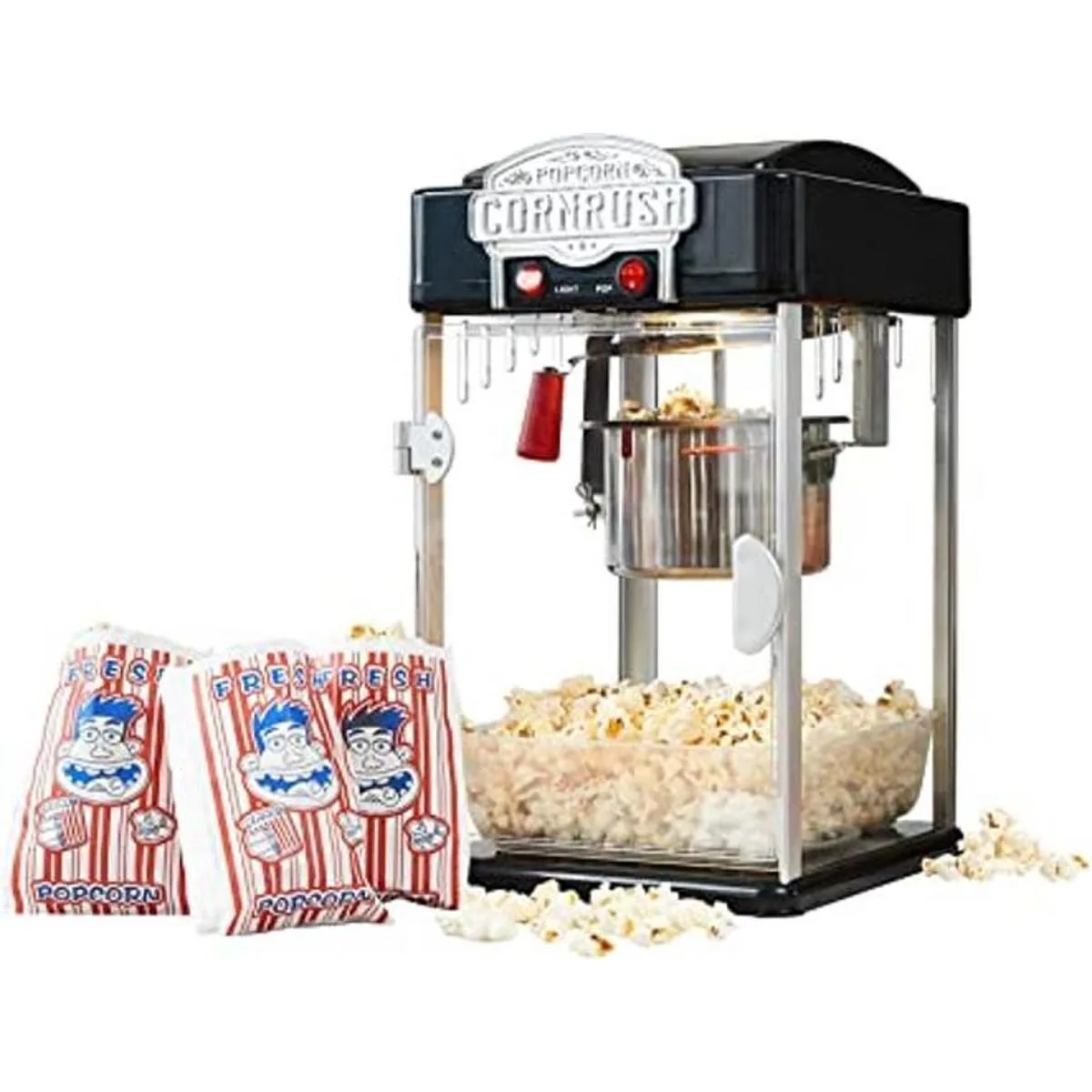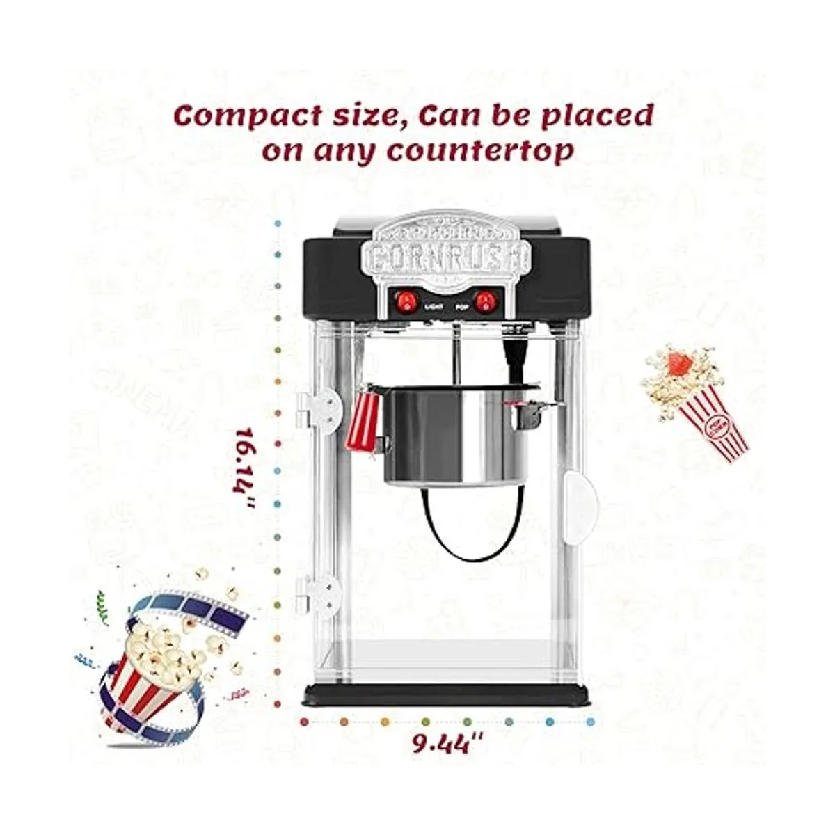 Diseño único: ventanas y puertas de plexiglás y resistente al calor para mantenerte a ti y a tu familia seguros. Interior iluminado para una fácil visualización y ambiente de habitación. Estilo de teatro profesional vintage para hacer palomitas de maíz.