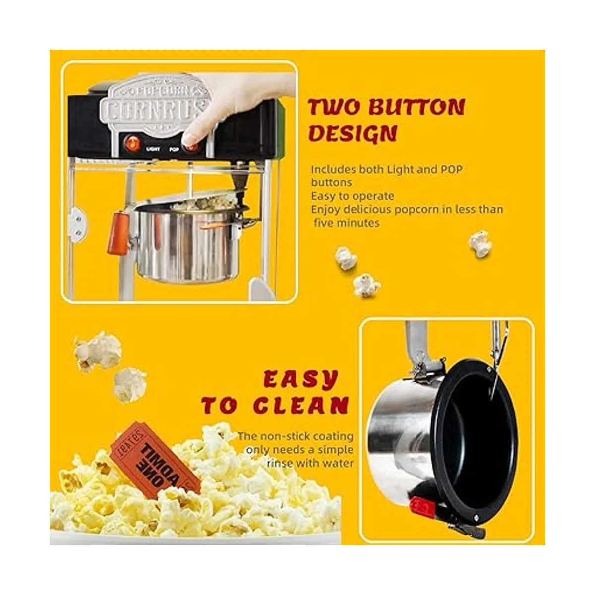 Fácil de limpiar: práctica bandeja extraíble para palomitas de maíz y hervidor de acero inoxidable y simplemente limpia con un paño suave.