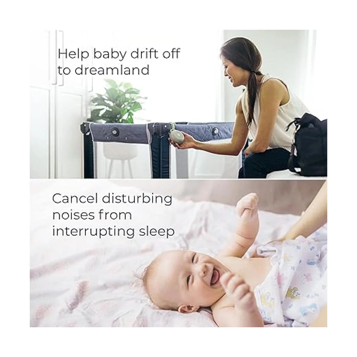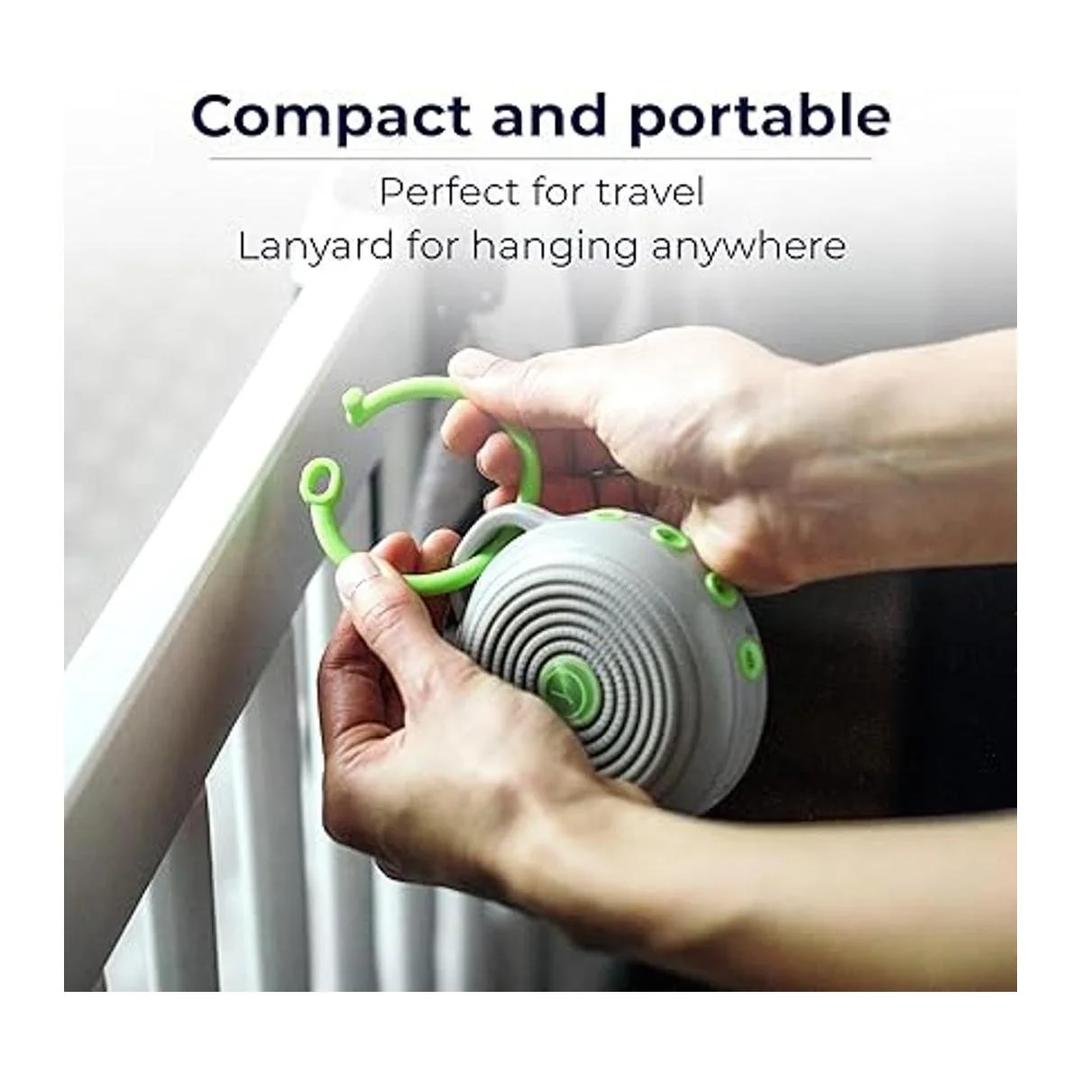 Portátil: simplemente fijar el Hushh al cochecito o al asiento del vehículo con el sujetador para cuidado de bebé o colocarlo sobre cualquier superficie. El sistema simple es fácil de usar y operar con una sola mano.