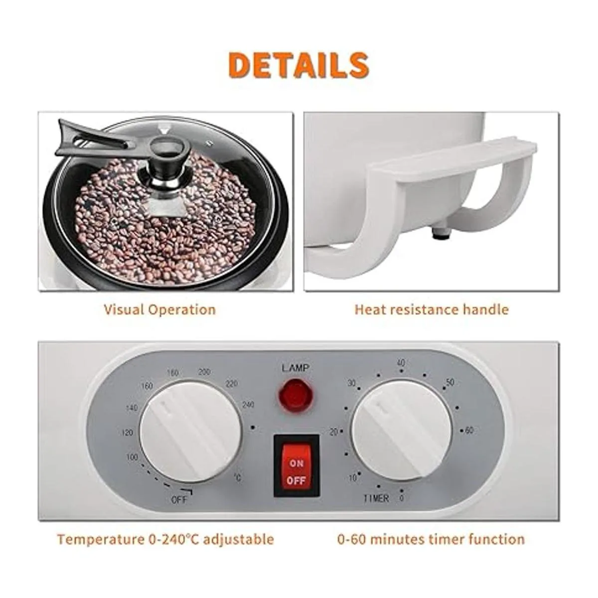 Tostadores de café mejorados de 110 V para uso doméstico: este tostador de café doméstico no solo tiene 0 a 60 minutos de función de temporizador, sino que también viene con temperatura ajustable de 212 a 464 F. Se puede ajustar libremente para hornear diferentes granos con un termostato profesional calentamiento automático de temperatura constante.