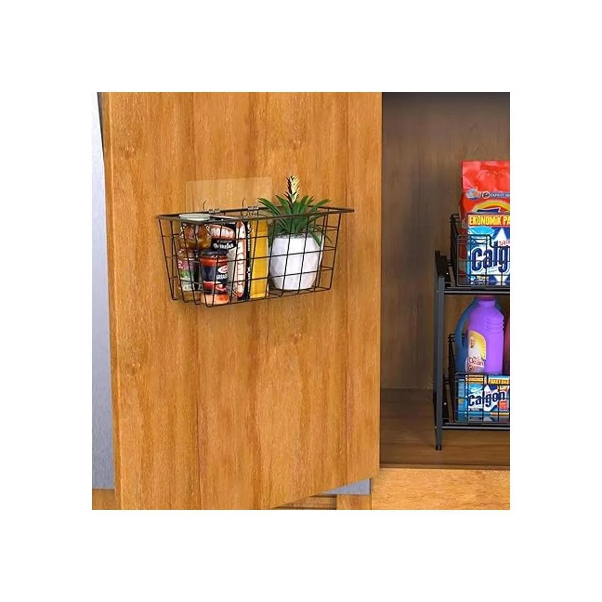MaraFansie Cestas colgantes de cocina, cesta de almacenamiento de alambre, cesta adhesiva sobre la puerta del gabinete, organizador sin taladrar, para organización de despensa de gabinete y cocina, baño, almacenamiento, paquete de 2, negro