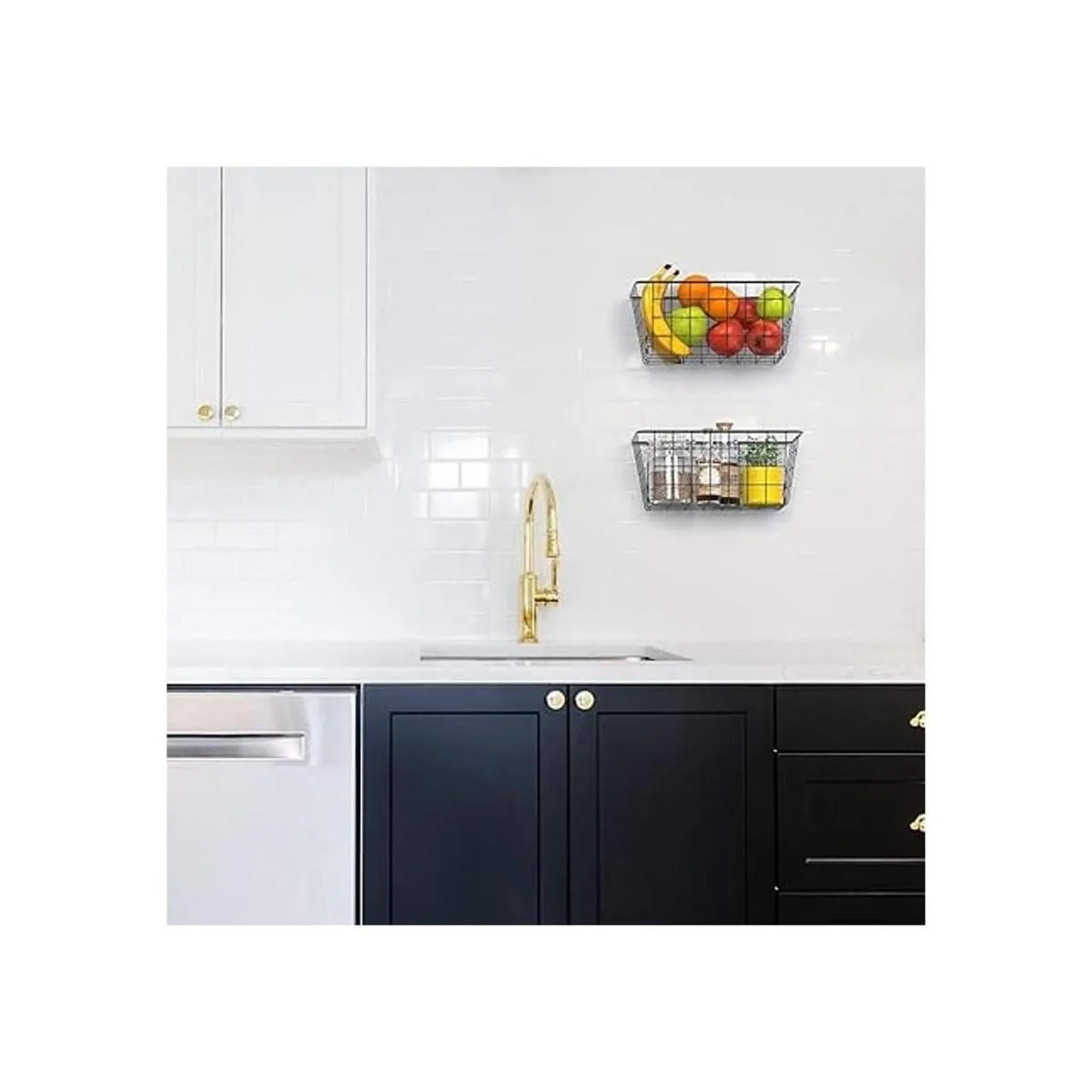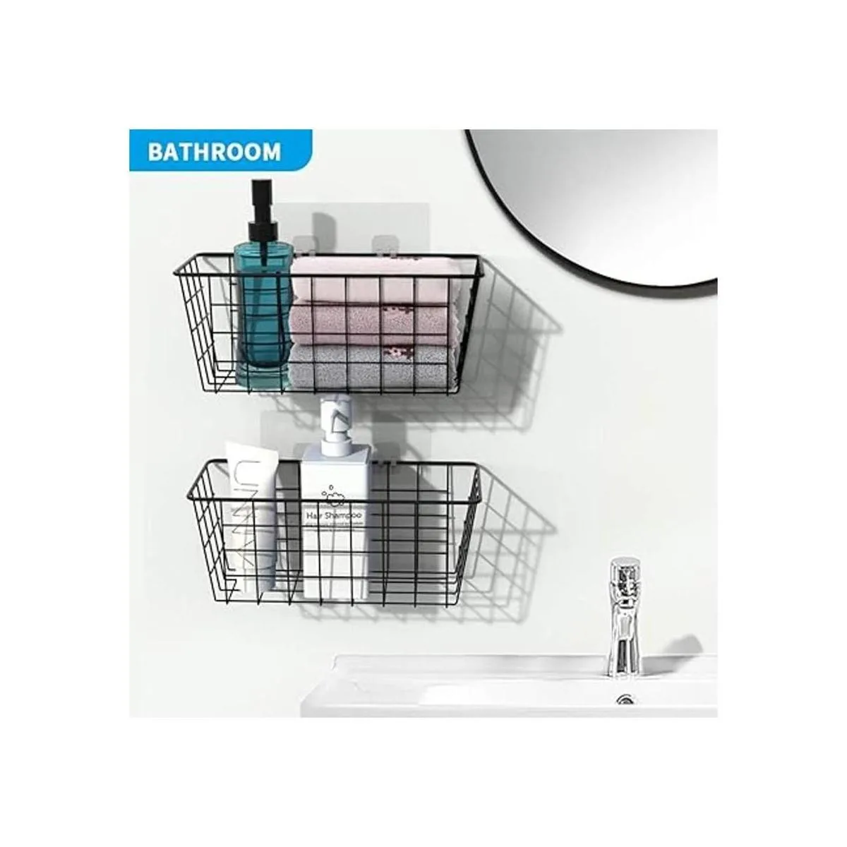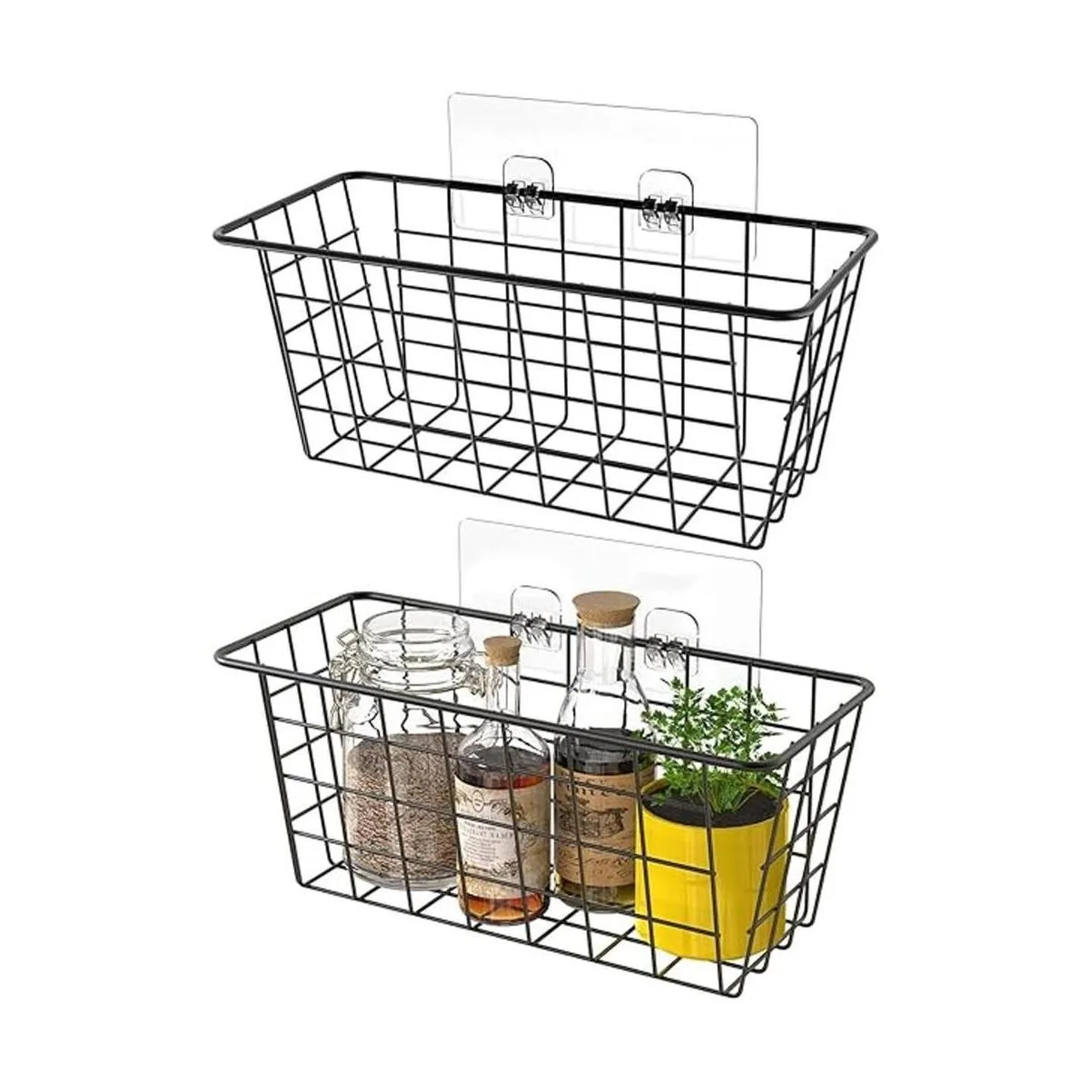 Fácil de usar: el diseño de alambre abierto te permite ver lo que hay dentro de la cesta de alambre, lo que significa que puedes encontrar fácilmente tus aperitivos, juguetes, herramientas o lo que necesites. Viene con 2 cestas de alambre y 2 tiras adhesivas.