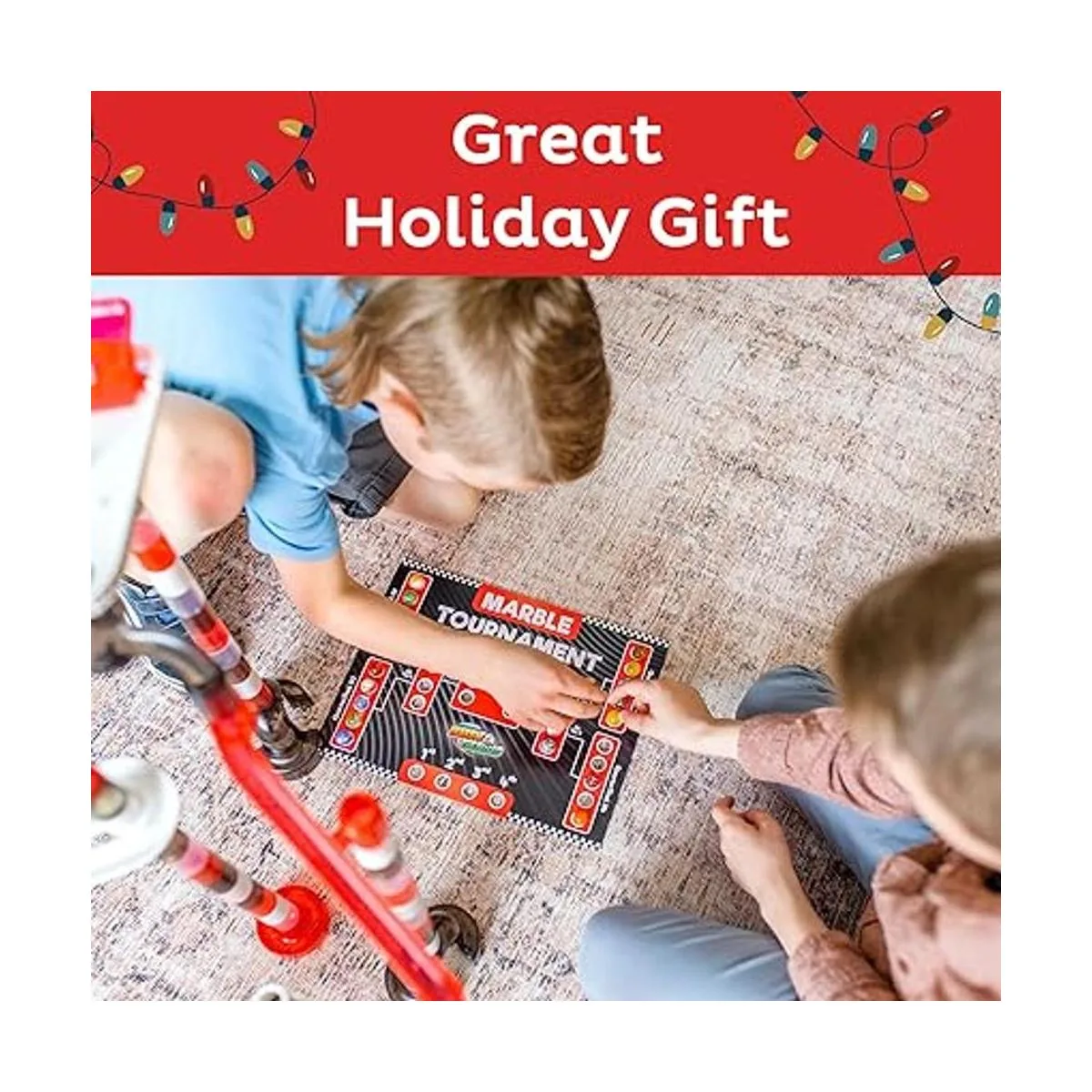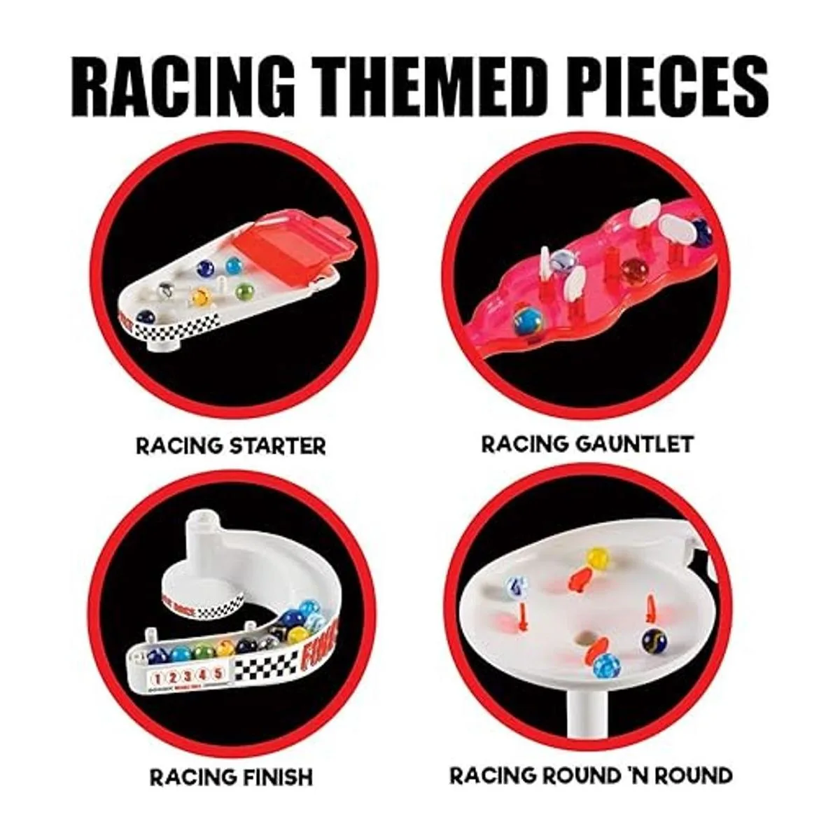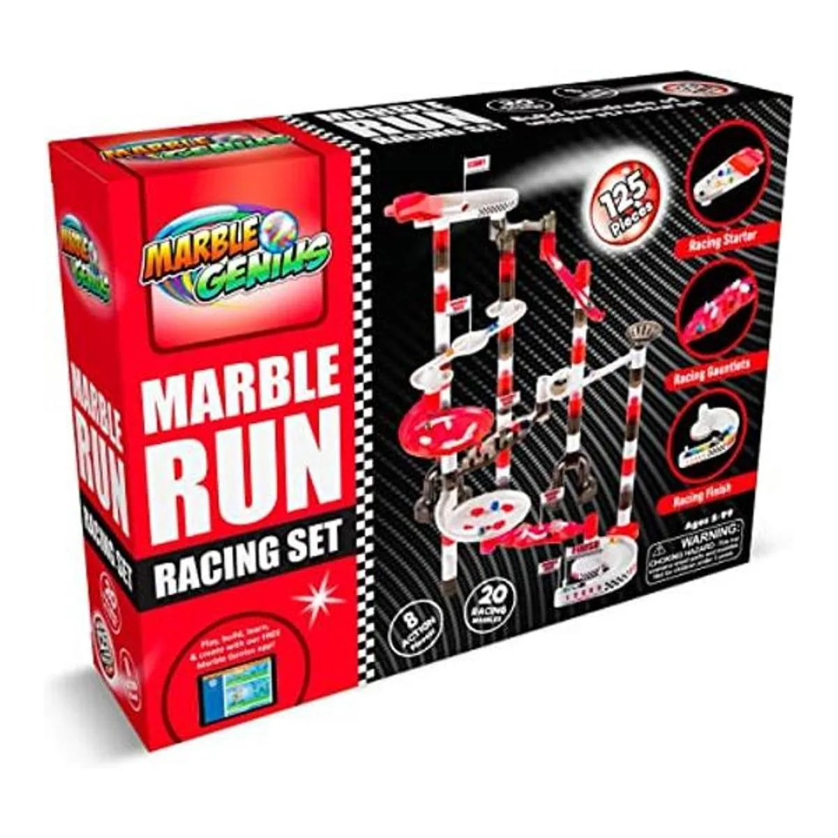 Marble Genius Juego de carreras 125 piezas con canicas de diseño, piezas de acción de carreras y tablero de torneos de Marble Genius