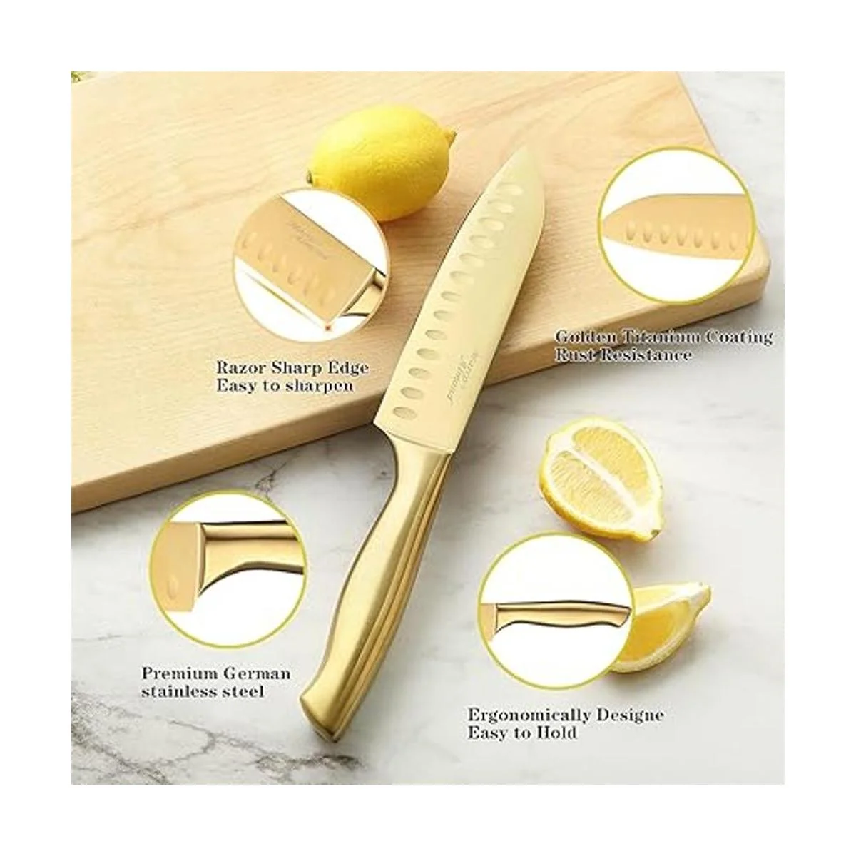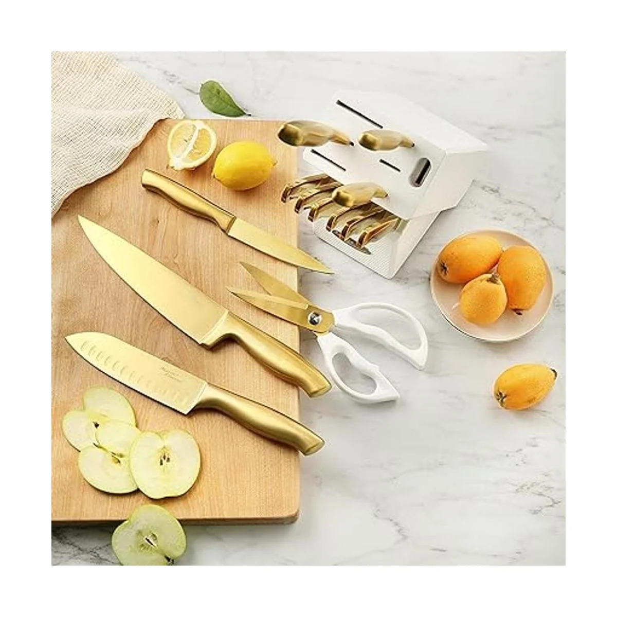 Juego de cuchillos de titanio dorado: el juego de cuchillos de cocina está hecho de acero inoxidable alemán de alta calidad con chapado en titanio para un rendimiento excepcional en la cocina. Los encantadores cuchillos de cocina dorados se unen con un bloque blanco que aporta al juego de cuchillos una belleza única. El acero inoxidable añade calidad y el titanio mejora la resistencia a la corrosión y mejora las propiedades antiadherentes.