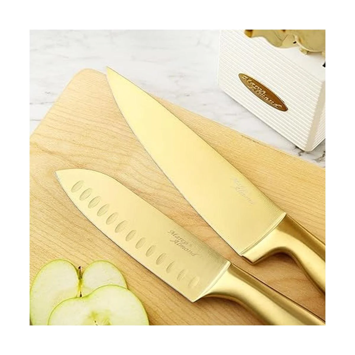 Marco Almond MA21 Juego de cuchillos dorados de lujo, revestimiento de titanio, 14 piezas de acero inoxidable, mango hueco dorado, juego de cuchillos de cocina con acabado blanco lavado de bloque de madera