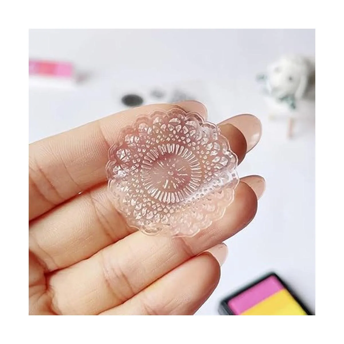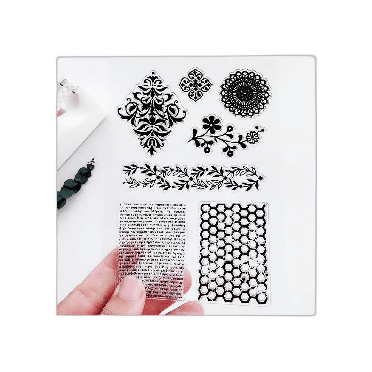 Material de calidad y seguro: estos sellos transparentes están hechos de material de silicona duradero, que es inodoro y ligero, no se rompe ni deforma fácilmente, te permite aplicar durante mucho tiempo, simplemente presiona el papel o la tarjeta suavemente, aparecerá una variedad de patrones.