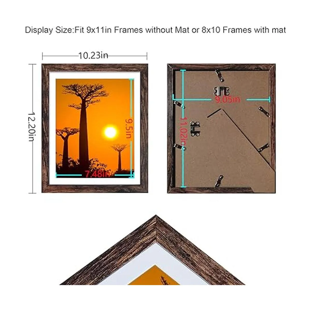 Tamaño: el tamaño total del marco es de aproximadamente 10.2 x 12.1 x 0.6 pulgadas, ideal para impresiones de 8 x 10 pulgadas con alfombrilla o 9 x 11 pulgadas sin alfombrilla.