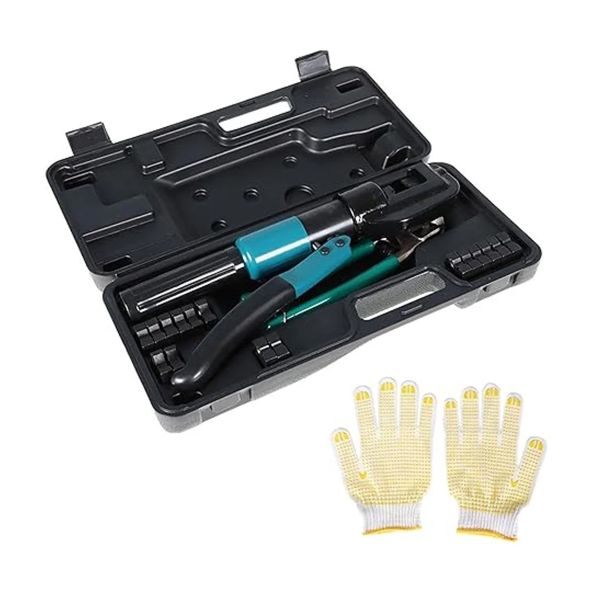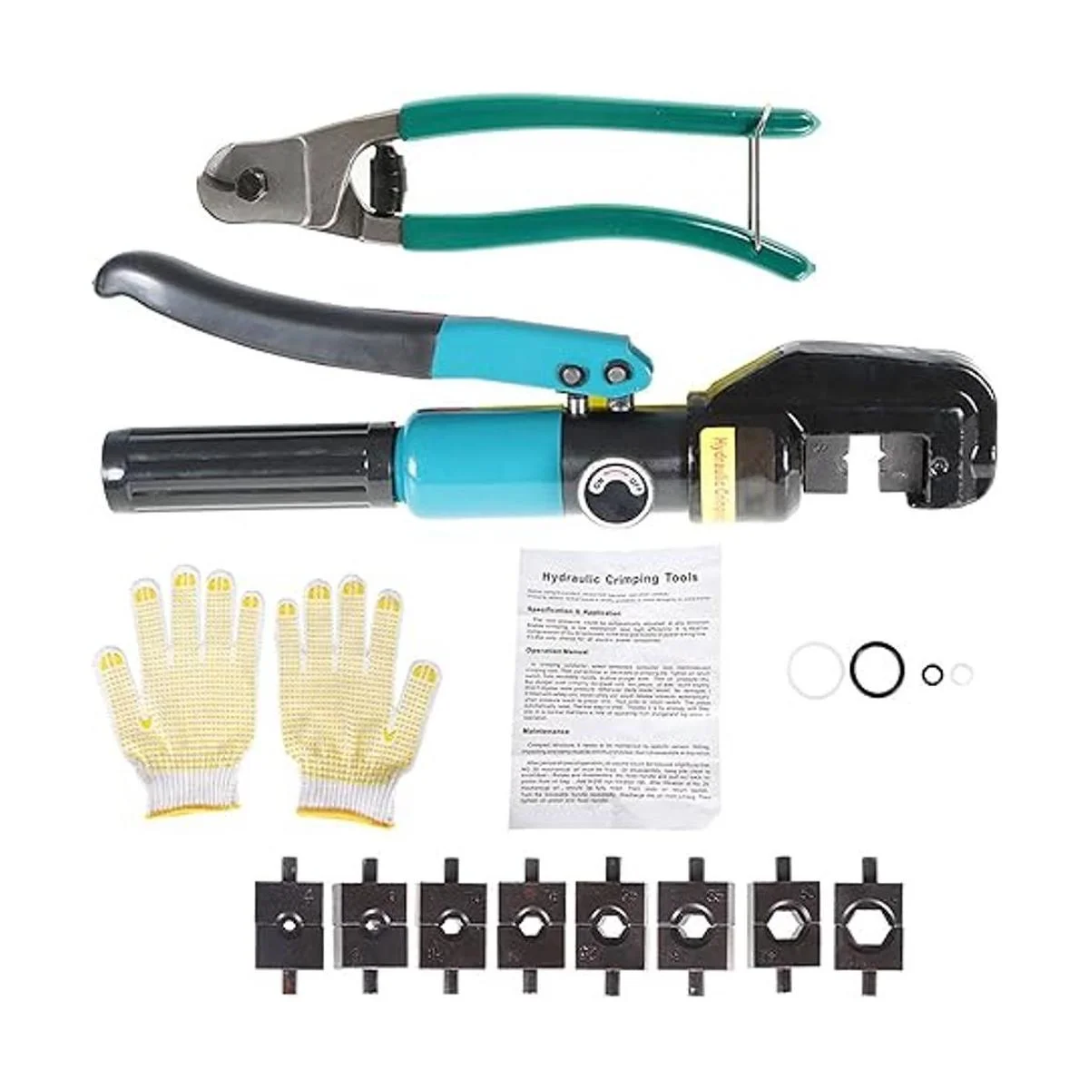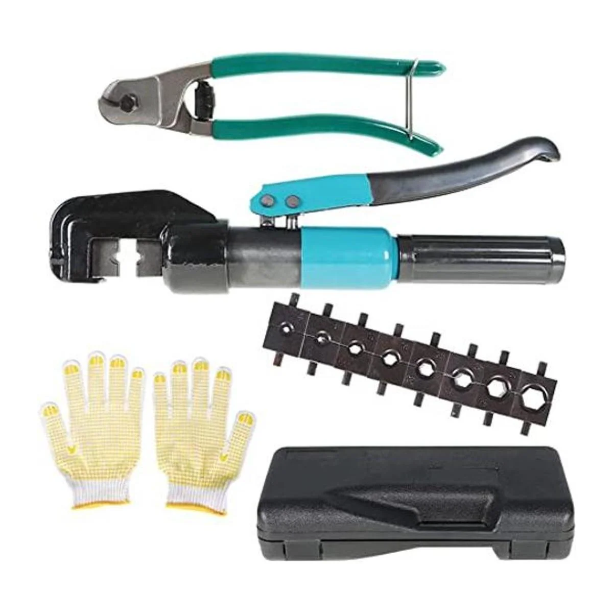 Lista del paquete: 1 crimpadora hidráulica 9 pares de troqueles de crimpado 1 cortador de cable anillos de sellado 1 par de guantes de trabajo 1 funda de transporte.