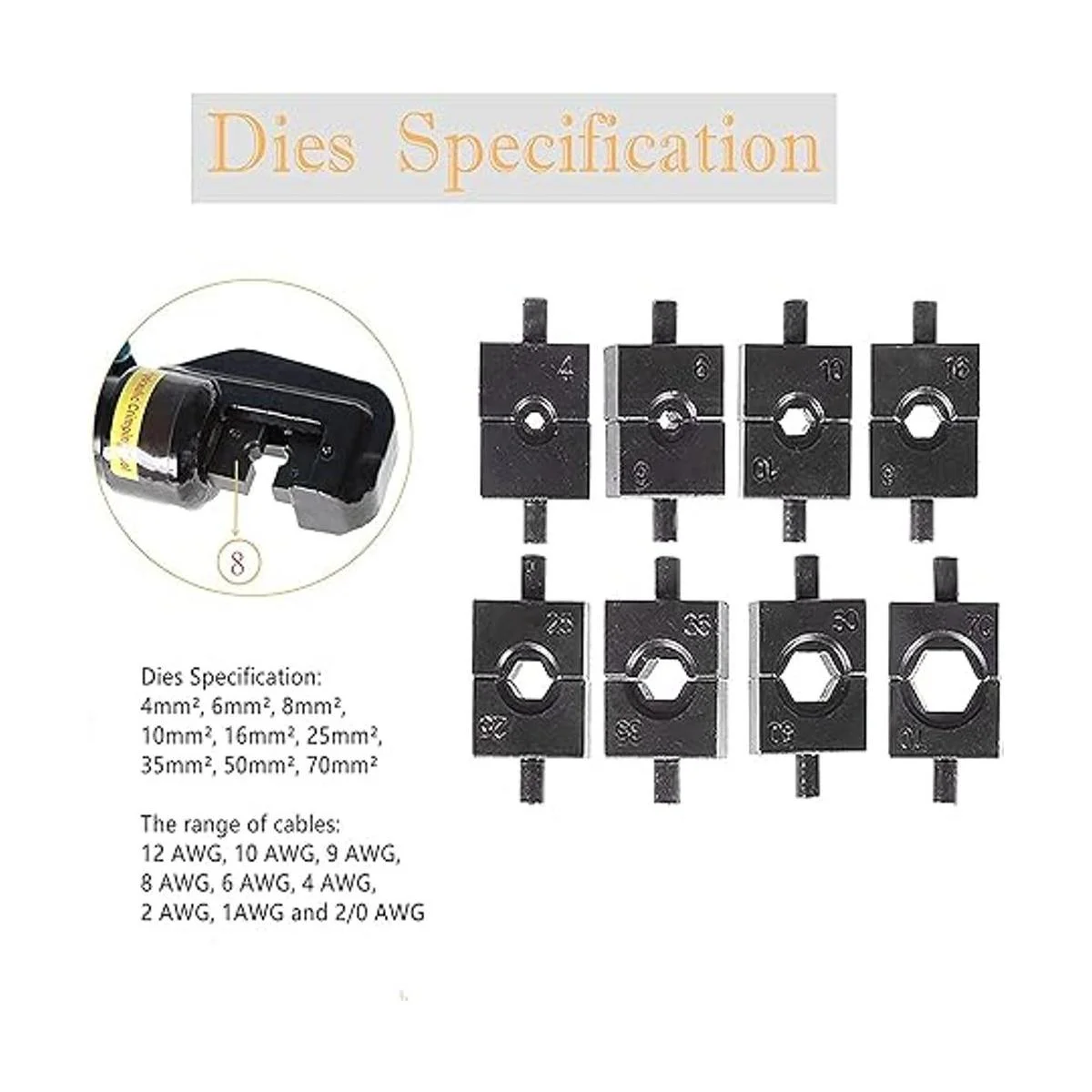 Especificaciones: incluye 9 pares de troqueles de engaste de 4, 6, 8, 10, 16, 25, 35, 50, 70 mm. Un juego de troqueles ha instalado en el crimpador.