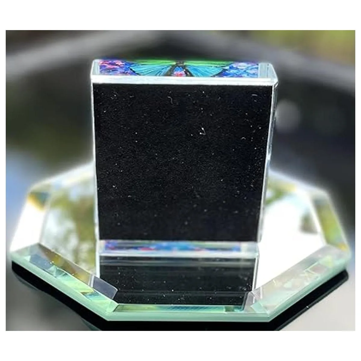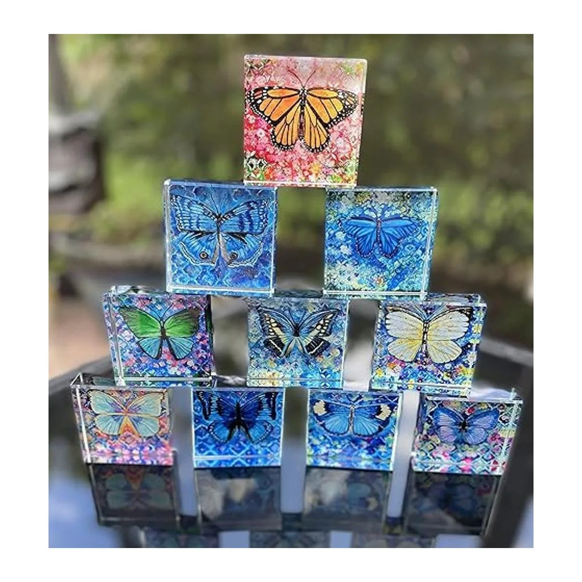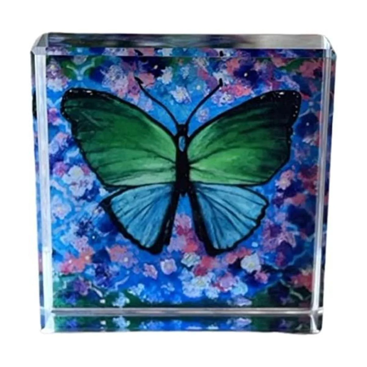 Hermoso arte de mariposa original hecho a mano incrustado en pisapapeles de cristal de alta calidad, mide 2.5 x 2.5 x 0.75 pulgadas