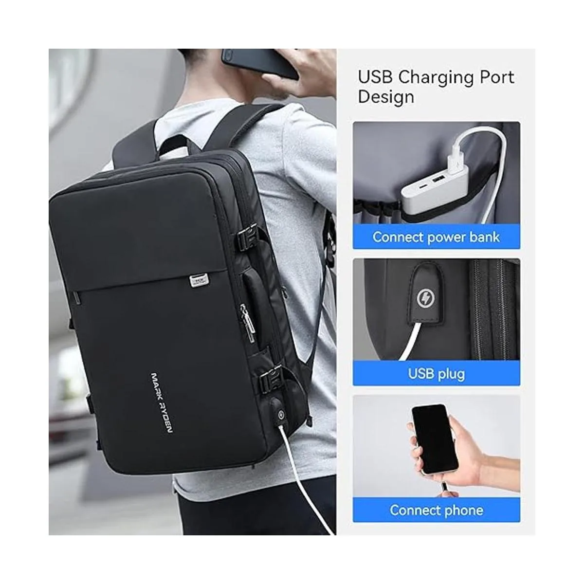 MARK RYDEN Mochila expandible para laptop de negocios para la escuela, viajes, trabajo, se adapta a laptop 17.3, Negro, 40L, Mochila de viaje