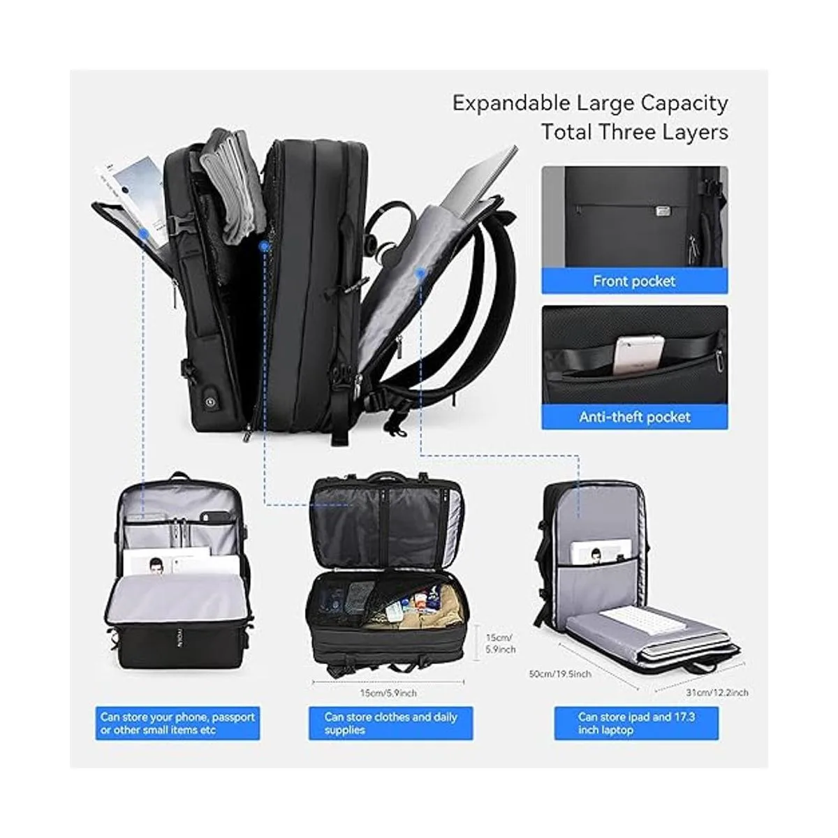 Gran capacidad expandible: capacidad comprimida de 23 L, cremallera de expansión completa que crea un 30 más de espacio de embalaje, capacidad de hasta 40 L, total de tres capas. El primer compartimento puede almacenar tu teléfono, pasaporte u otros objetos pequeños, etc. El segundo compartimento puede almacenar ropa y suministros diarios. El tercer compartimento es un compartimento para laptop, que puede almacenar una laptop de 17.3 pulgadas, así como una laptop de 15.6 pulgadas, 14 pulgadas y 13 pulgadas.