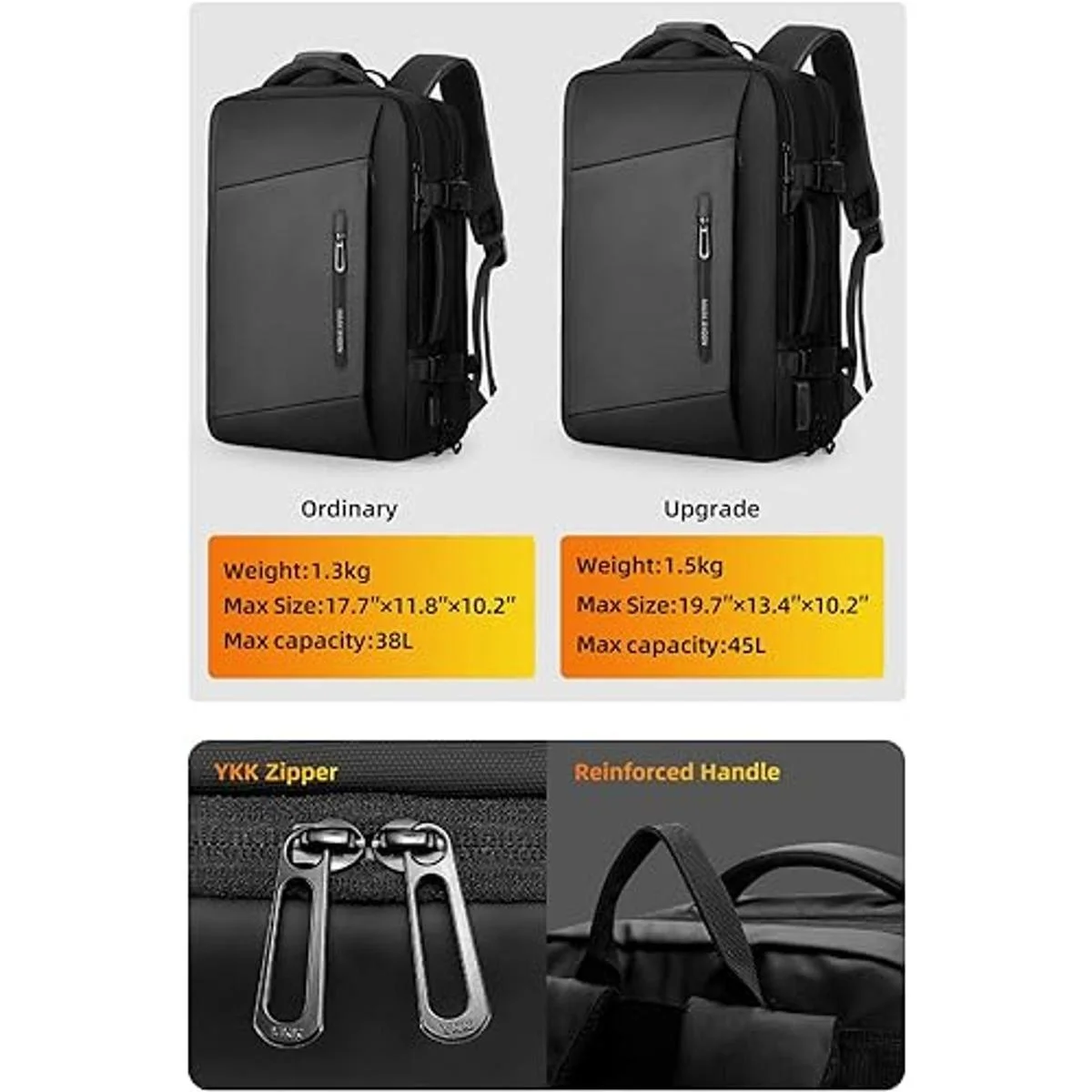 Gran capacidad y ampliable: 19.7 x 13.4 x 6.3 pulgadas normal, 19.7 x 13.4 x 10.2 pulgadas extendida. Mochila de viaje mejorada con bolsillos laterales para botellas de agua. Abre la cremallera de expansión, el espacio de embalaje se puede aumentar de 30 L a 45 L. La bolsa principal puede contener fácilmente 7 días de equipo de viaje. Esta mochila de viaje. Esta mochila de viaje tiene un grueso independiente Compartimento para portátil para proteger mejor tu costoso portátil de arañazos.