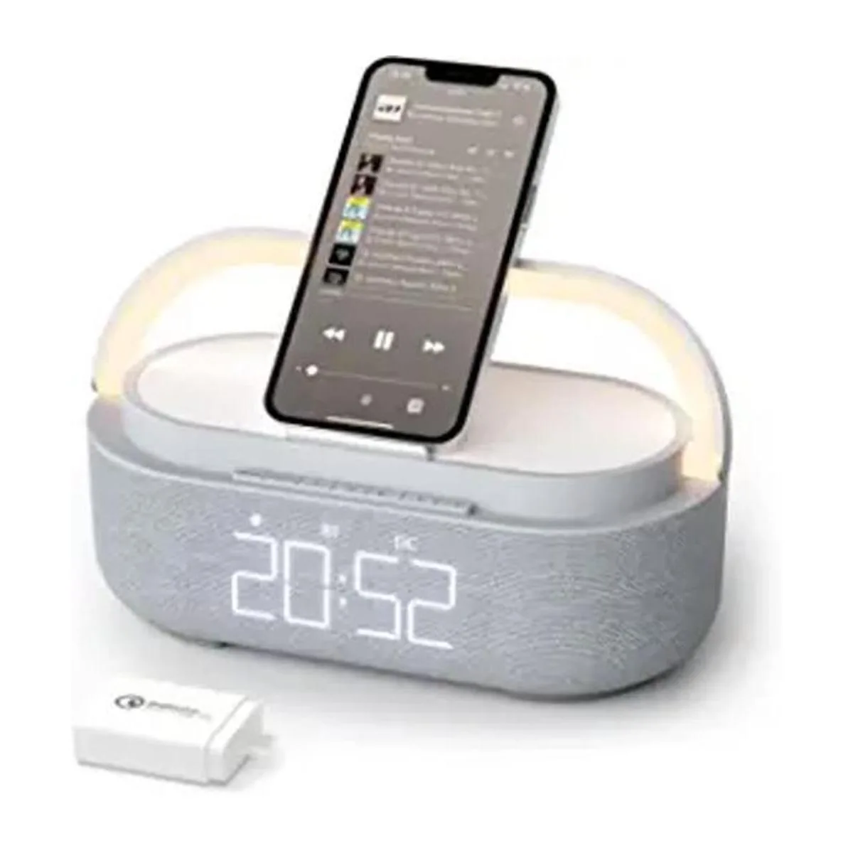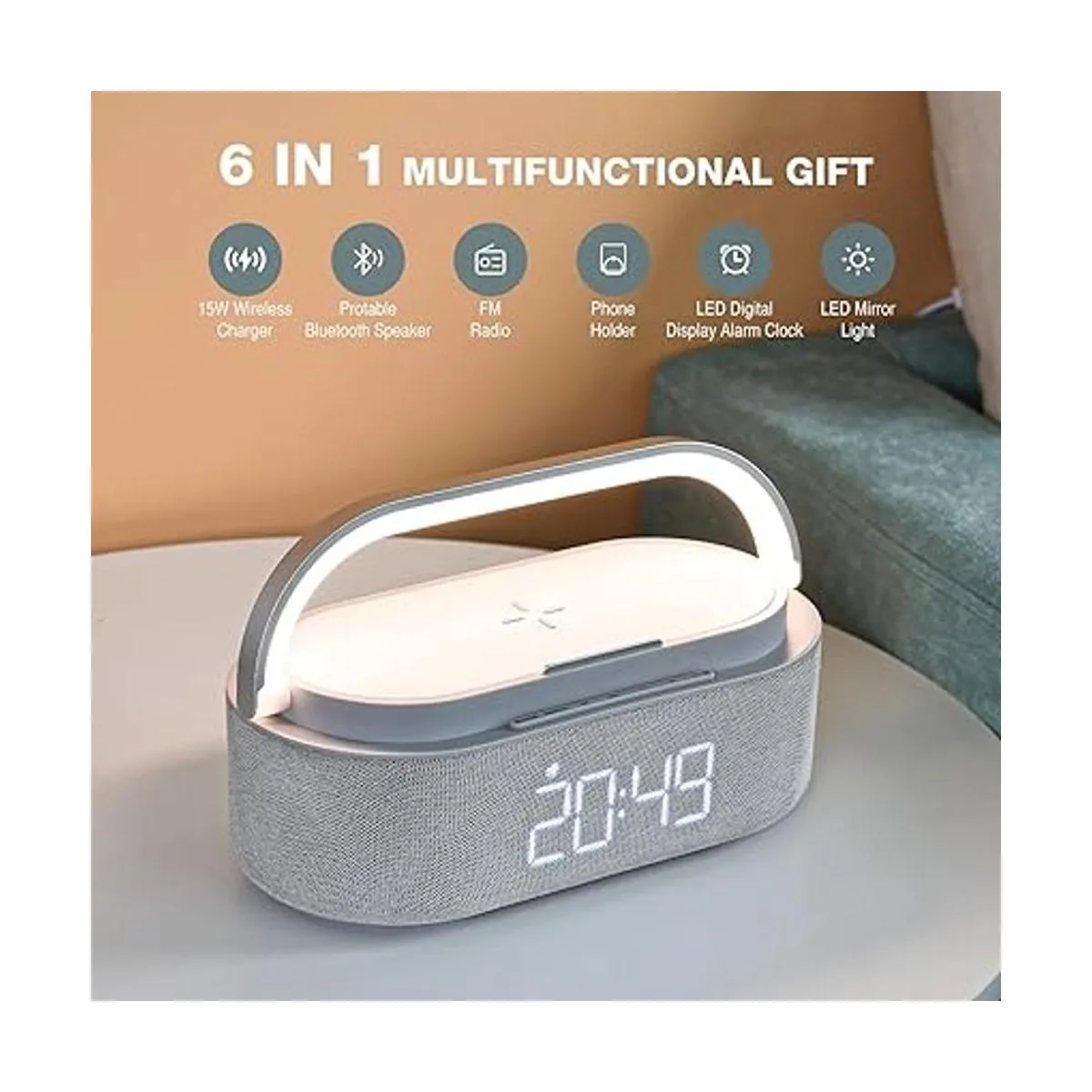 Diseño de reloj despertador multifuncional 6 en 1: puedes obtener altavoz Bluetooth, reloj despertador digital, cargador inalámbrico de 15 W, radio FM luz nocturna ajustable de 4 niveles soporte para teléfono. Un artículo realiza todas tus necesidades de escritorio y mesita de noche y hace que tu escritorio desordenado se limpie al instante.