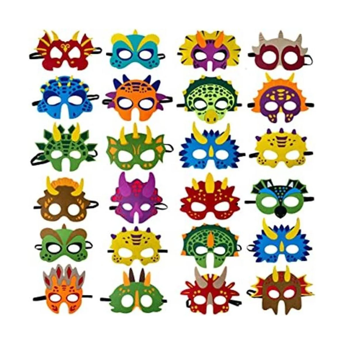 Máscaras de dinosaurios para fiestas paquete de 24 fieltro y elástico para niños, decoraciones de fiesta de dinosaurios con 24 máscaras de diferentes tipos, gran idea para fiestas de cumpleaños