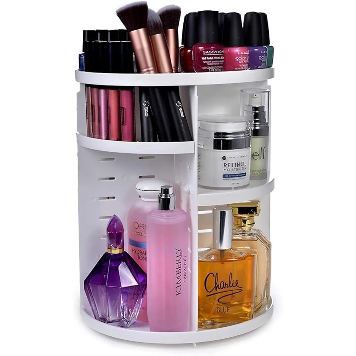 Organizador de maquillaje con rotación de 360 grados Almacena toda tu rutina de maquillaje en un solo lugar y permite un fácil acceso a todos tus cosméticos, productos para el cuidado de la piel y accesorios