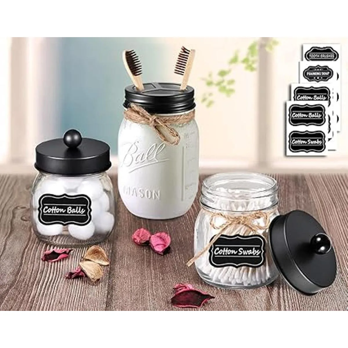 4 tapas para tarros de masón no incluidas: este juego de tapas incluye 1 bomba dispensadora de jabón, 1 tapa para cepillo de dientes y 2 tapas de tarros de almacenamiento de boticario, 1 adhesivo de jabón espumoso, 1 etiqueta de cepillo de dientes, 1 adhesivo de bola de algodón. Estas tapas se ajustan a cualquier marca de tarro de albañil de tamaño regular bola, Kerr, Anchor Hocking, Libbey, y muchos más. Es un bonito juego de accesorios para el hogar shabby chic que puedes conseguir. Decoración rústica moderna ideal para casa de campo Los componentes de acero inoxidable 304 evitan el óxido y la corrosión