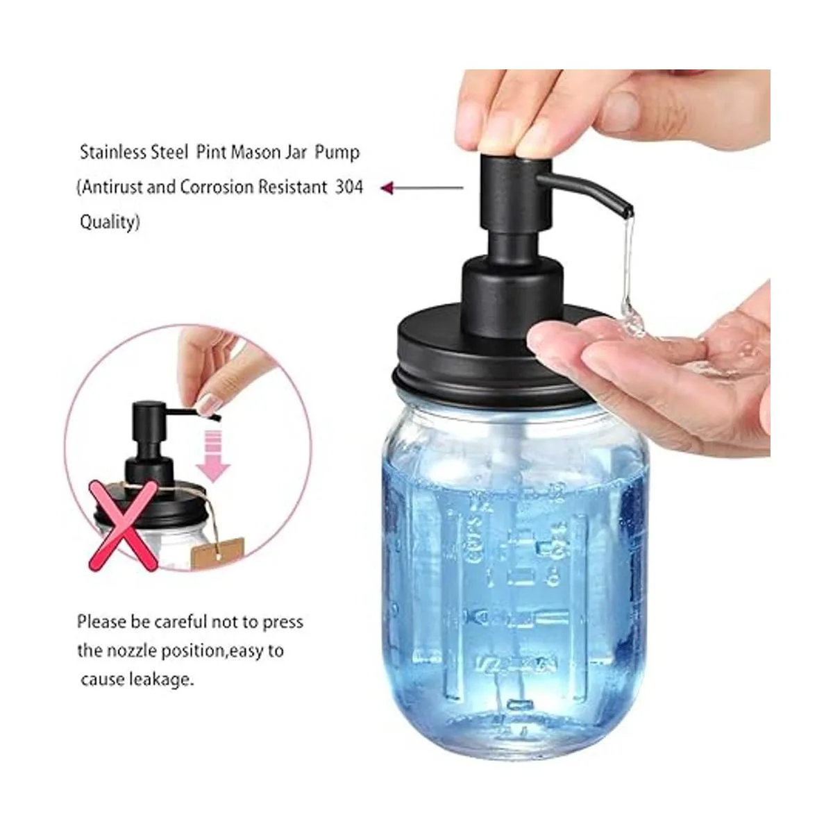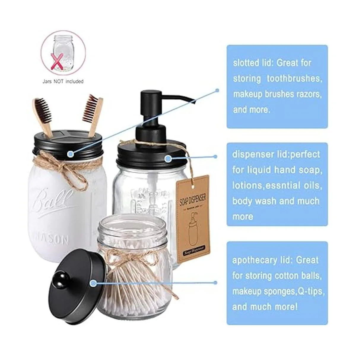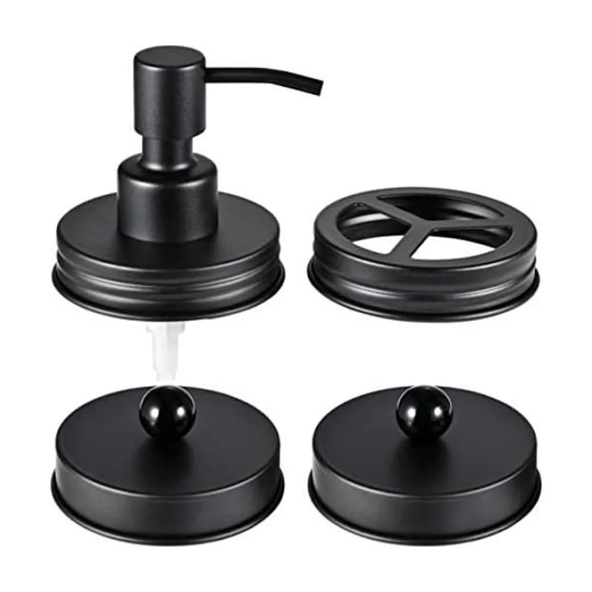 Mason Jar Juego de tapas de accesorios de baño 4 unidades, tarros no incluidos, dispensador de jabón, soporte para cepillo de dientes y tapas de tarros de almacenamiento de boticario para frascos de boca regular, acero inoxidable inoxidable, negro