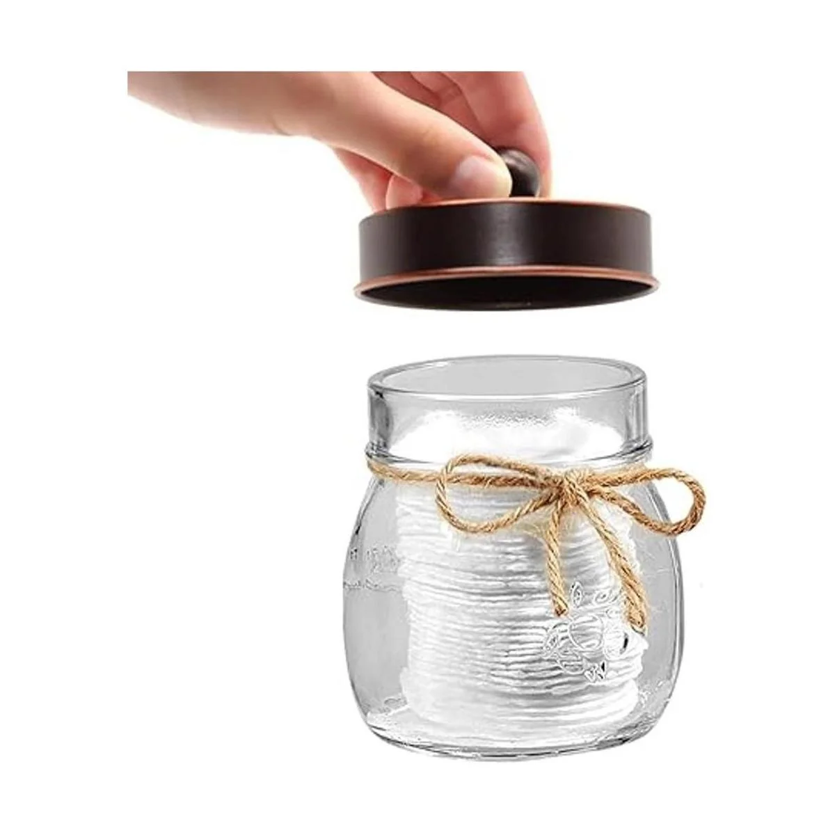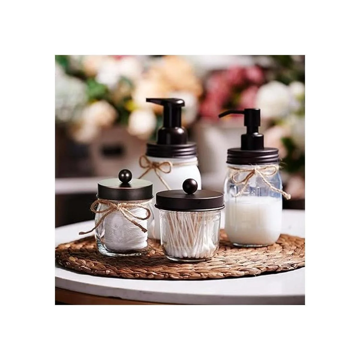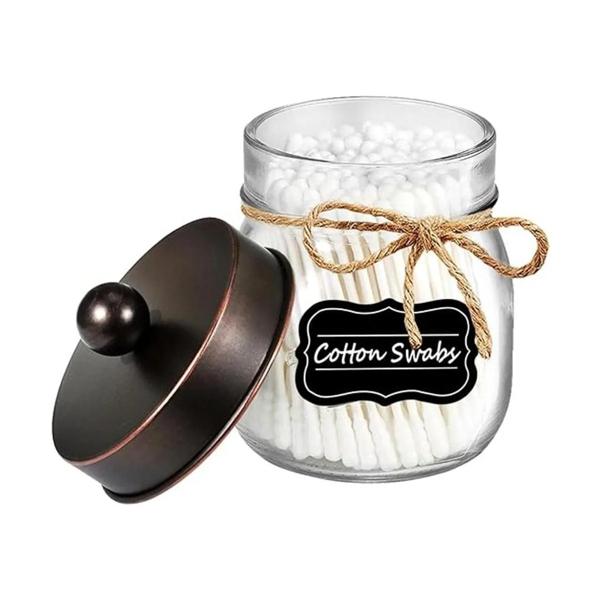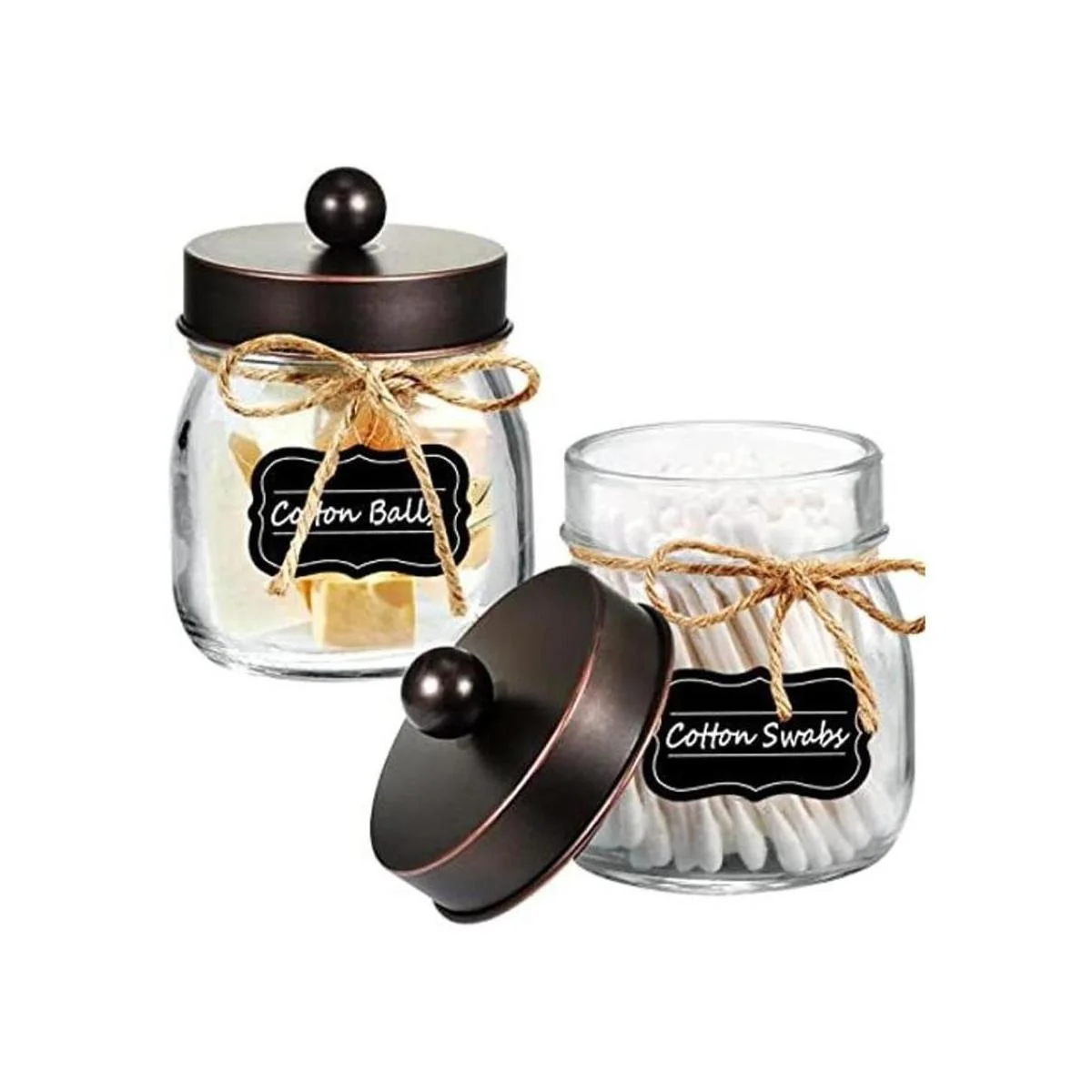 Mason Jar Organizador de almacenamiento de baño, bronce aceitado, accesorios de baño de decoración rústica de granja, dispensador de soporte Qtip tarros de boticario de vidrio para Qtips, hisopos de algodón, pelota, hilo dental paquete de 2