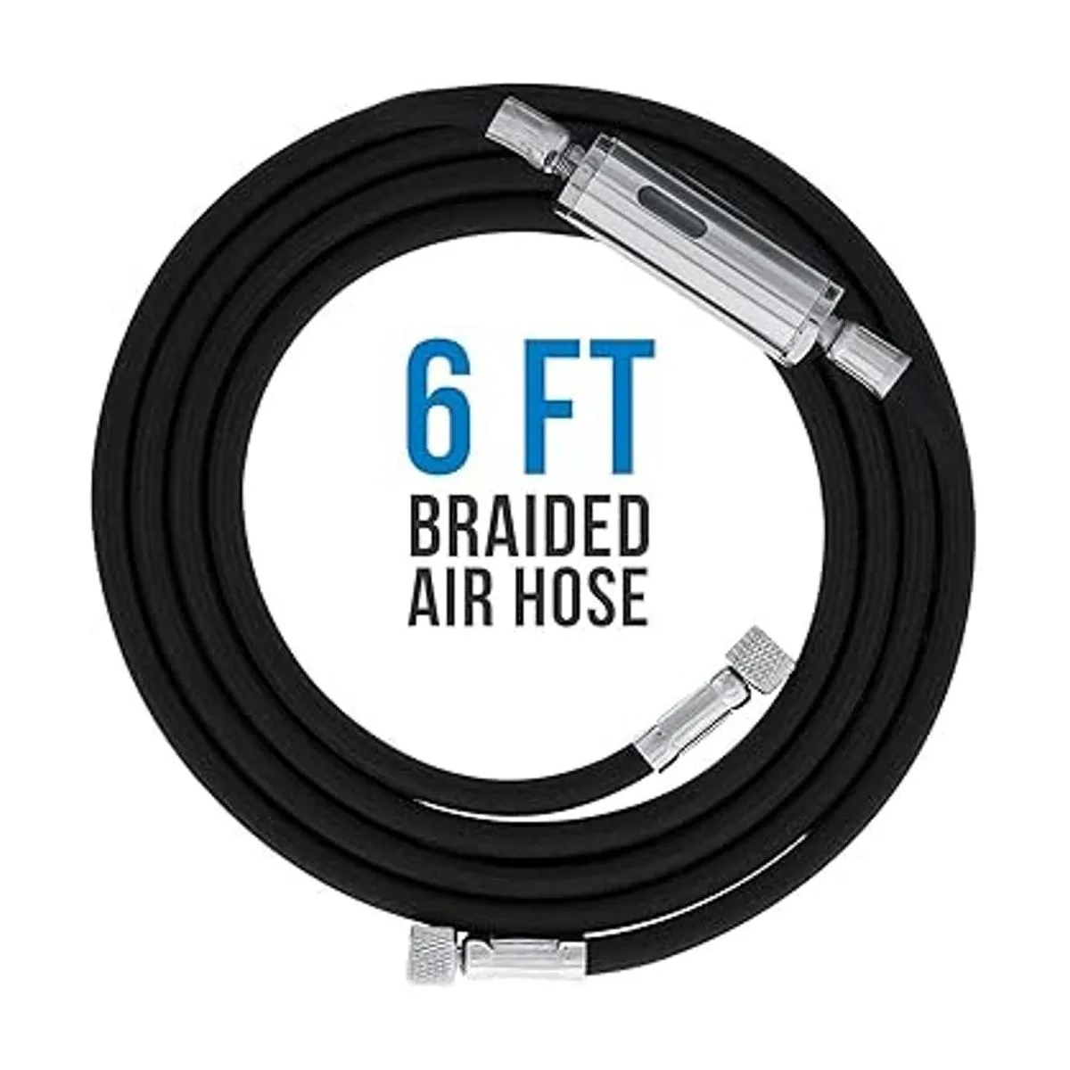Un compresor de estación de trabajo compacto ideal Incluye un soporte para aerógrafo integrado y una manguera de aire trenzada de 6 pies con un mini filtro de humedad en línea