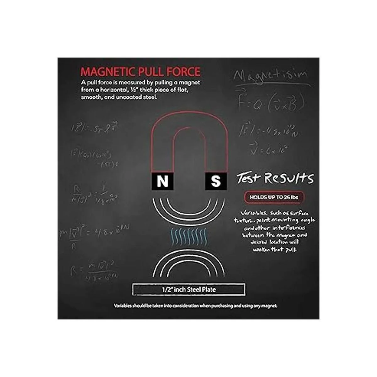Fuerza de tracción probada: la fuerza de tracción del imán se prueba utilizando una placa de acero suave, plana, horizontal, de 0.5 pulgadas de grosor. A medida que el imán se tira hacia arriba, una herramienta mide la fuerza justo antes de que el imán se libere. Variables como ángulo de montaje, textura, pintura, etc. interferirá entre el imán y la ubicación de colgar y debilitará la conexión. Considera estas variables al comprar/usar cualquier imán.